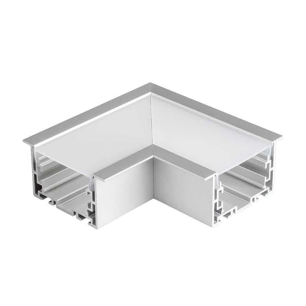 Прямой угол в сборе для соединения двух профилей S2-LINIA69-F под прямым углом 90° в одной плоскости в комплекте с матовым экраном и соединителями. Экран образует линию на плоскости. Применятся при изготовлении светильников сложной геометрии.