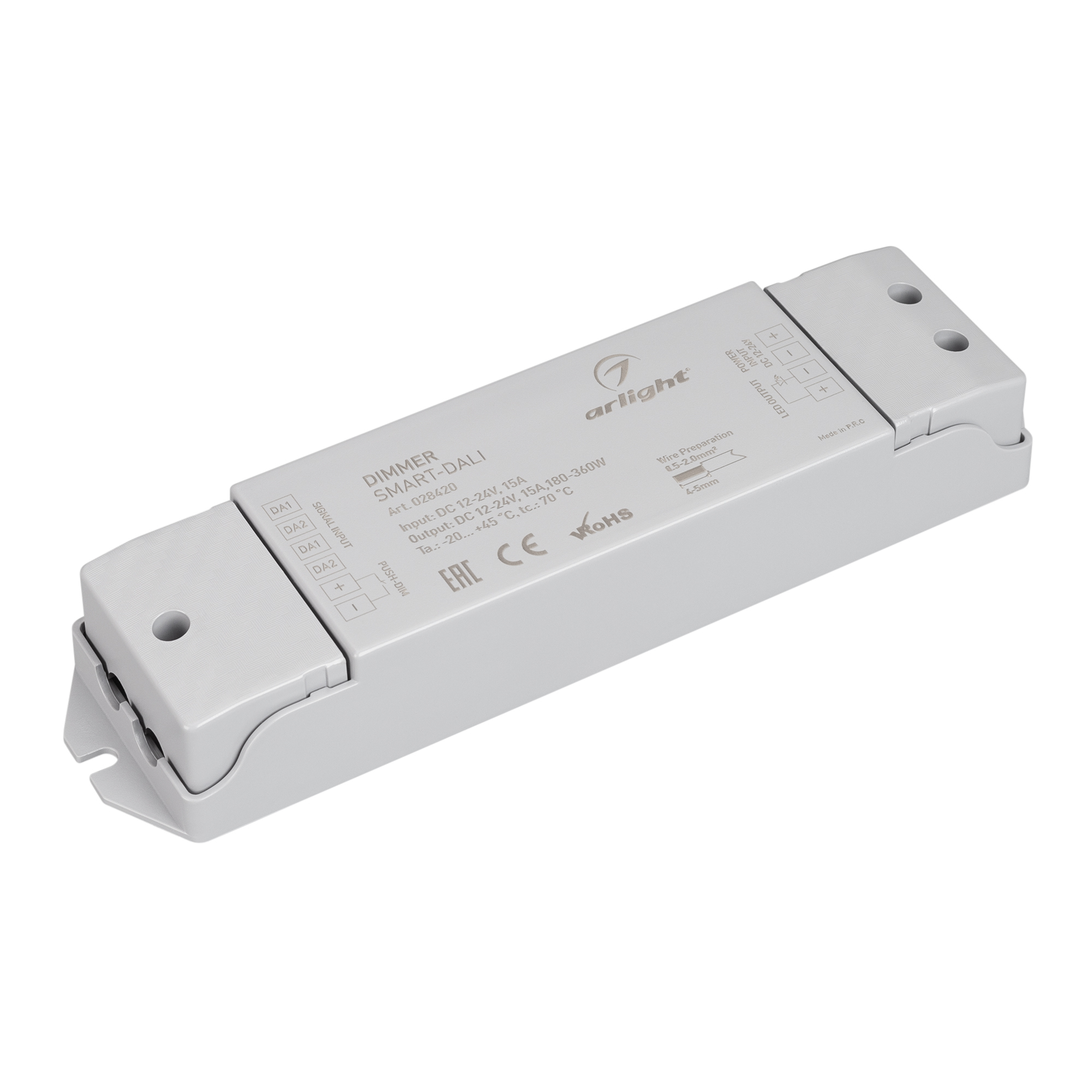 Мощный 1-канальный диммер для управления одноцветной светодиодной лентой в протоколе DALI. Устройство имеет входной сигнал DALI и совместимо со всеми блоками питания и панелями с выходом DALI марки Arlight и Intelligent Arlight. Питание диммера имеет диапазон напряжений от 12В до 24В, максимальный ток 15А на 1 канал, максимальная мощность 180-360Вт (в зависимости от напряжения питания). Габариты диммера составляют 175х45х27мм, корпус изготовлен из пластика серого цвета.