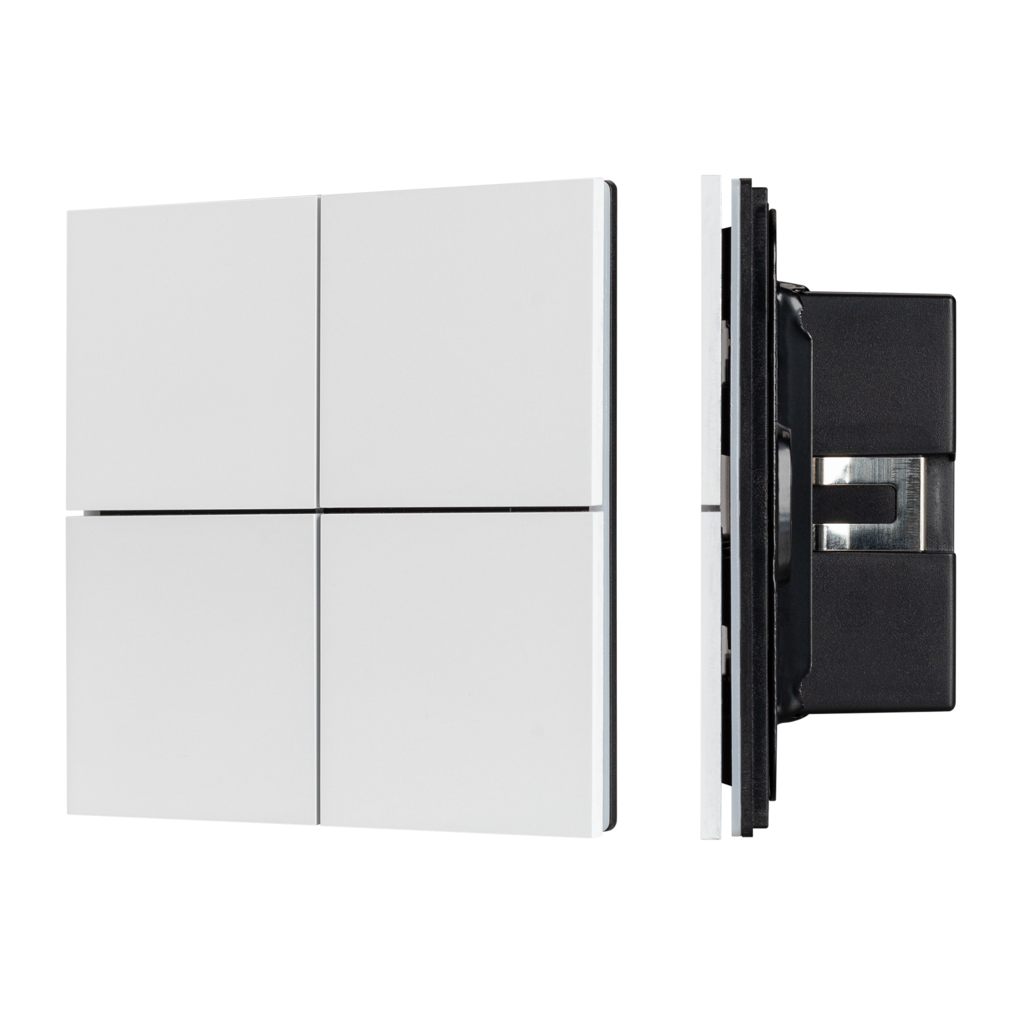 Встраиваемая металлическая панель белого цвета с кнопочным управлением, предназначенная для включения и выключения световых сцен в системах управления светом KNX. Позволяет осуществлять включение/выключение, диммирование, управление шторами и жалюзи, управлять сценами. Поддерживает управление с помощью 4 настраиваемых рокерных клавиш. Каждая клавиша может выполнять функции 2-х клавиш. Устройство совместимо с исполнительными устройствами стандарта KNX, в том числе, мировых производителей ABB, SCHNEIDER ELECTRIC, SIEMENS, ZENNIO и другими. Удобное и точное управление при помощи отдельных механических кнопок для каждой функции. Питание от шины KNX. Габариты устройства составляют 86x86x33 мм. Пластиковый корпус, цвет белый, безрамочный корпус, материал - алюминий, отклик вибрацией, светодиодная индикация.