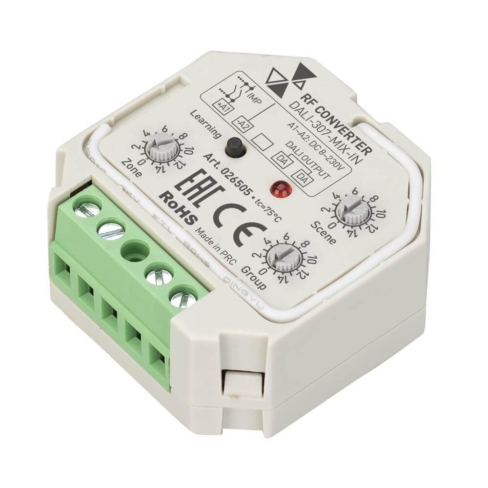 Конвертер предназначен для транслирования команд от радиопультов и панелей серии Excellent в шину DALI. Интерфейс DALI DT8. Устройство может управлять стандартными диммерами DALI для мультибелых (MIX) источников света: светодиодной ленты, светодиодных светильников и других источников света, управляемых по DALI. Конвертер управляет одной группой DALI и включает до 4-х сцен (в зависимости от типа используемого пульта). Возможна работа в широковещательном режиме (Broadcast). Режим работы устанавливается вращающимися переключателями на корпусе конвертера. Наличие входа PUSH-Switch позволяет подключить внешнюю кнопку или настенный выклоючатель. Питание устройства от шины DALI, внешнее питание не требуется. Габариты конвертера составляют 45.5x45x20.3мм, корпус белого цвета, удобная установка в стандартную монтажную коробку.