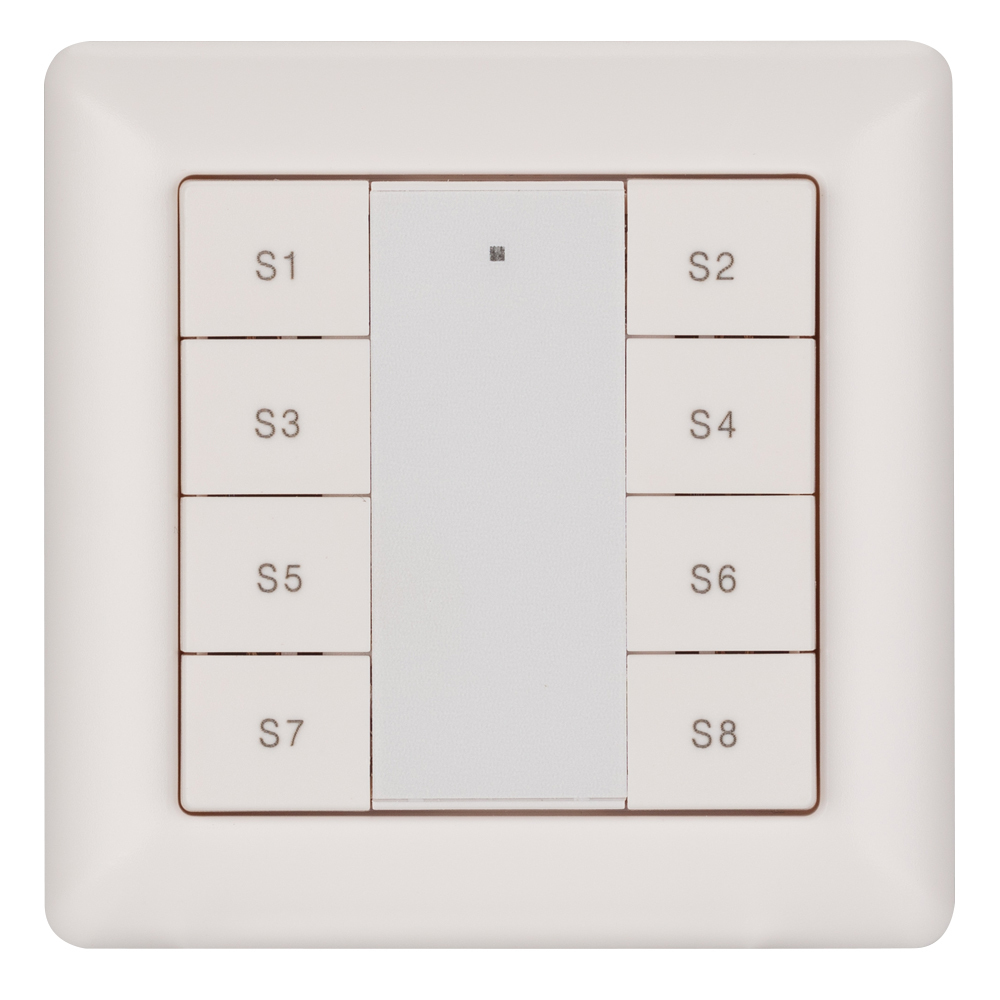 Встраиваемая пластиковая панель белого цвета с кнопочным управлением, предназначенная для включения и выключения световых сцен в системах управления светом DALI. Позволяет включать/выключать световые сцены в одной группе или для всех подключенных исполнительных устройств (Broadcast). Установка номера группы и сцен выполняется переключателями на задней стороне панели. Поддерживает управление 8 сценами. Устройство совместимо с диммерами стандарта DALI. Передача команд от панели к диммерам выполняется по общей двухпроводной шине DALI. Удобное и точное управление при помощи отдельных механических кнопок для каждой функции. Питание от шины DALI. Габариты устройства составляют 81х81х22.5 мм, установка в стандартную монтажную коробку. Панель совместима с декоративными рамками ведущих мировых производителей (GIRA, JUNG, BERKER, MERTEN). Стандартная рамка входит в комплект поставки.