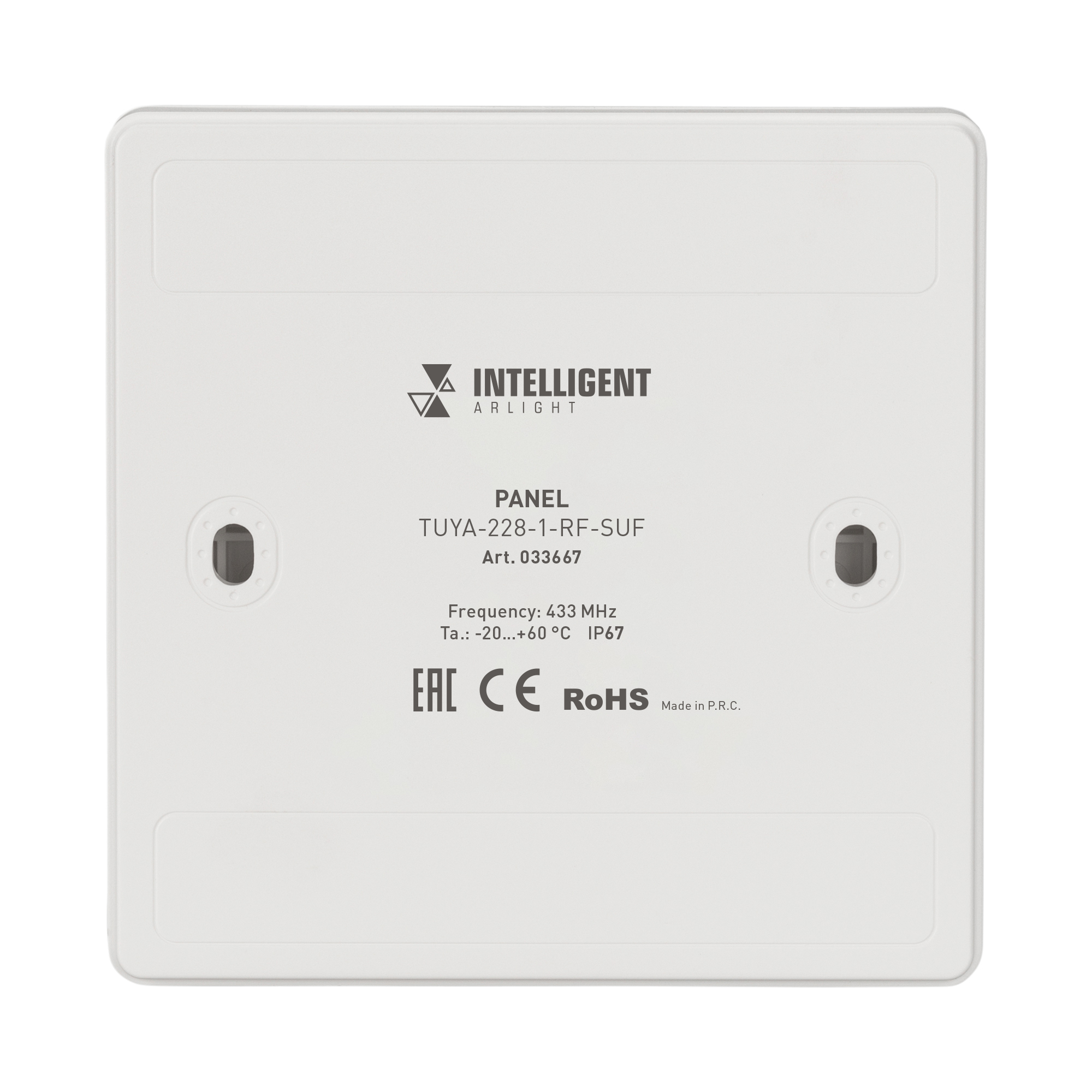 Накладная кнопочная панель белого цвета, изготовленная из пластика. Предназначена для управления одноцветными источниками света (ШИМ) с помощью кнопок. Основные выполняемые функции: включение и выключение света, регулировка яркости. Удобное и точное управление с помощью эргономичных кнопок. Изделие применяется в качестве однозонного пульта дистанционного управления диммерами и релейными модули серий TUYA-***-WF и TY-***-WF, поддерживающими управление по радиоканалу 433MHz. Не требует питания, имеет встроенный кинетический источник питания. Габариты панели 86х86х14 мм, корпус выполнен из пластика. Устройство устанавливается на любую поверхность, к которой возможно прикрутить монтажную базу панели.