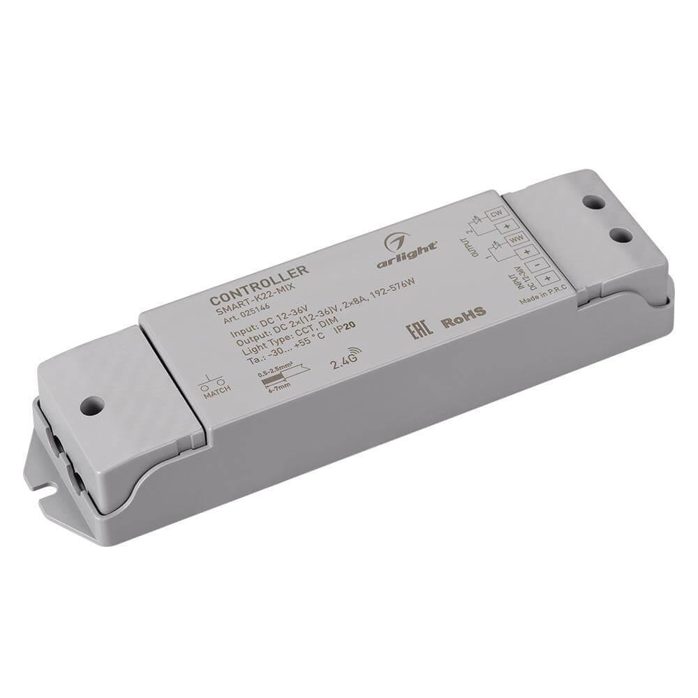 Контроллер для светодиодной MIX ленты (ШИМ). Питание/рабочее напряжение 12-36VDC, максимальный ток 8A на канал, 2 канала, максимальная мощность 192-576W. Винтовые клеммы. Корпус - PVC. Габариты 175x45x27 мм. Управляется пультами и панелями серии SMART (поставляются отдельно).