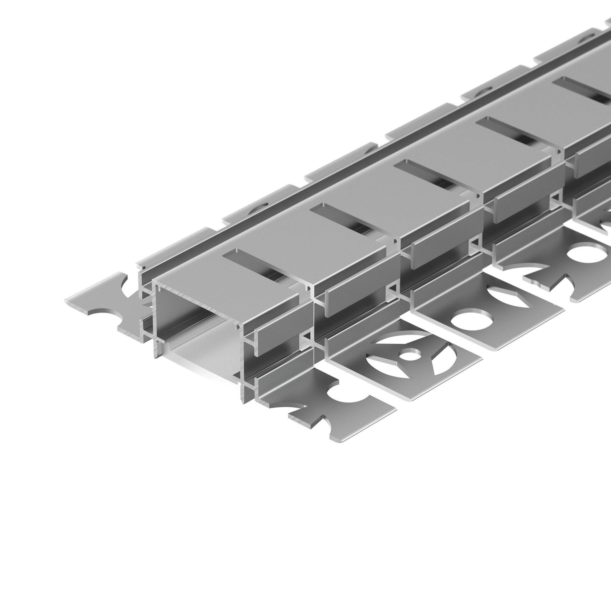 Встраиваемый гибкий профиль из анодированного алюминия со скрытым фланцем под строительную отделку устанавливается в потолки и потолочные ниши из гипсокартона. Минимальный радиус горизонтального изгиба (вправо/влево) 50 см.