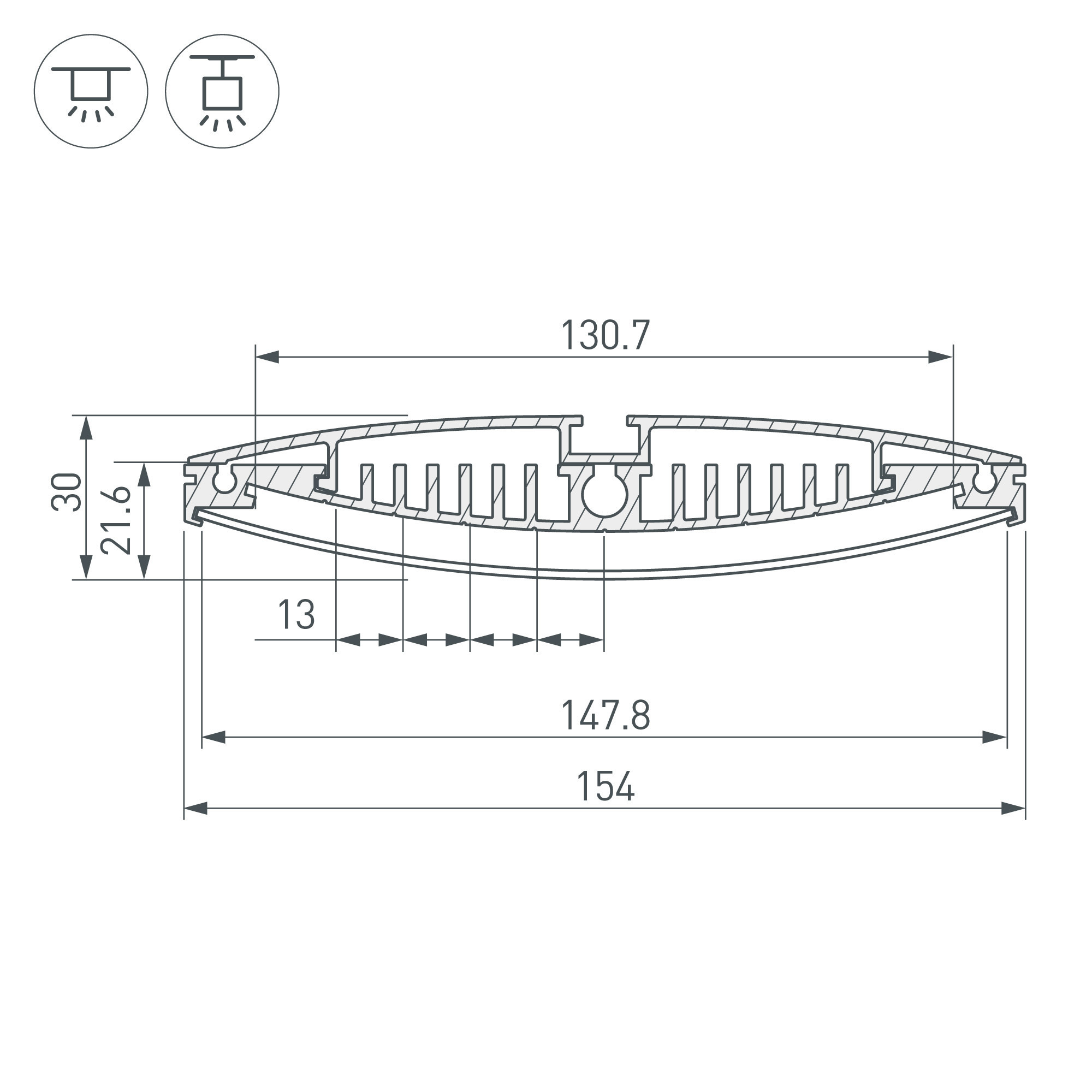 Габаритные размеры профиля составляют 2000 мм в длину, 154 мм в ширину и 21,6 мм в высоту. Площадка для установки светодиодных лент позволяет использовать ленту шириной до 130 мм и мощностью до 50 Вт/м. Это обеспечивает гибкость в выборе светодиодных лент и создает потрясающие световые решения.