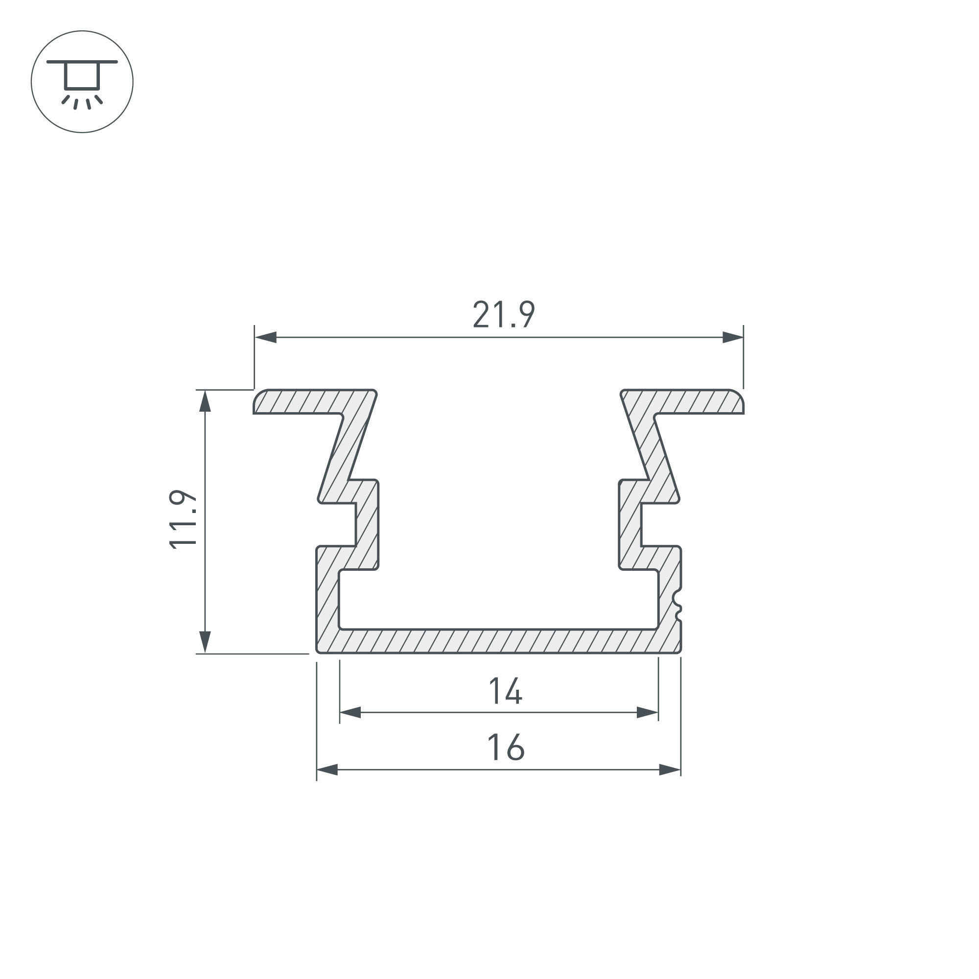 Габаритные размеры профиля составляют 2000 мм в длину, 22 мм в ширину и 12,2 мм в высоту. Площадка для установки светодиодных лент позволяет использовать ленту шириной до 14 мм и мощностью до 17 Вт/м. Это обеспечивает гибкость в выборе светодиодных лент и создает потрясающие световые решения.