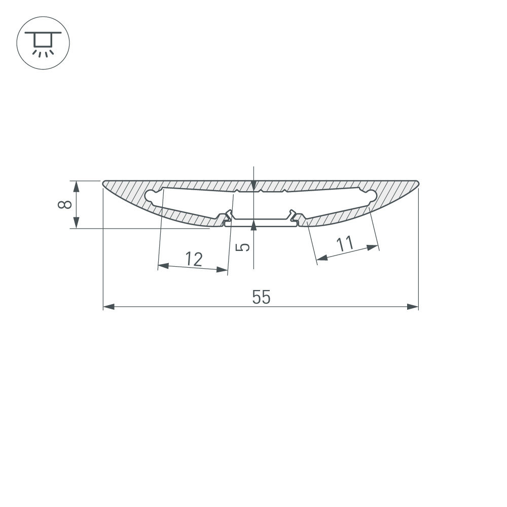 Алюминиевый светотехнический профиль для установки светодиодной ленты или линейки. Цвет серебристый. Длина 2020 мм, размер сечения 54,9х8 мм. Специальная форма профиля позволяет использовать его в том числе на полу. Монтаж осуществляется накладным способом. Рассеиваемая тепловая мощность 29 Вт/м позволяет подобрать источник света необходимой яркости и температуры свечения и реализовать самые интересные решения.