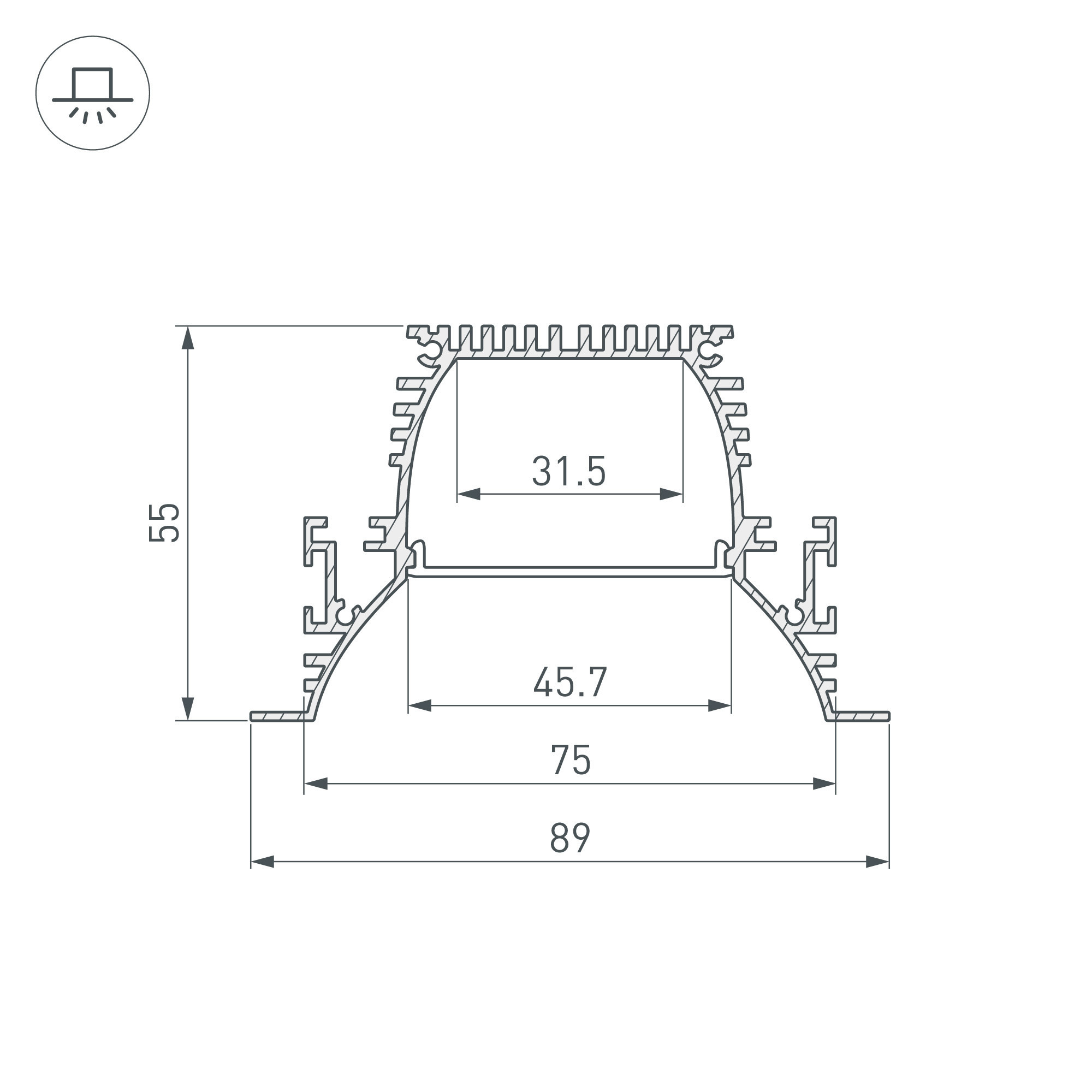 Под заказ от 10 м. Алюминиевый анодированный встраиваемый профиль для светодиодных лент и линеек. Габаритные размеры (L×W×H): 2000x90x55 мм. Паз для установки 75мм. Ширина площадки для ленты 31,5 мм. Экраны, заглушки и другие аксессуары приобретаются отдельно. Цена за 1 метр.