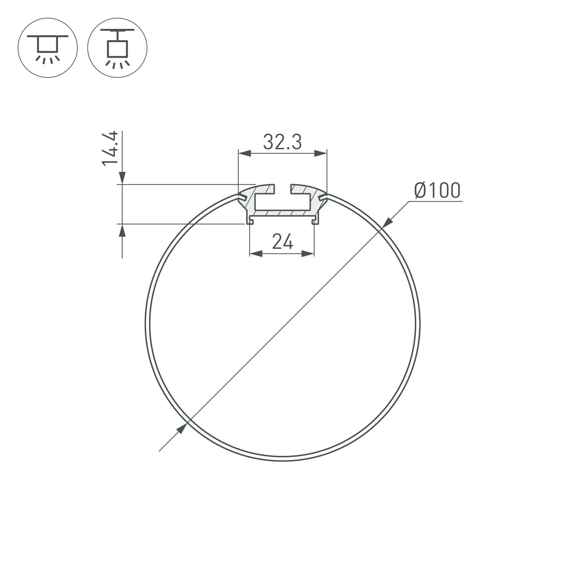 Подвесной профиль из анодированного алюминия для основного освещения. Габаритные размеры профиля с круглым рассеивателем составляют 2000 мм в длину, 100 мм в ширину и 100 мм в высоту. Площадка для установки светодиодных лент позволяет использовать ленту шириной до 24 мм и мощностью до 21,5 Вт/м.