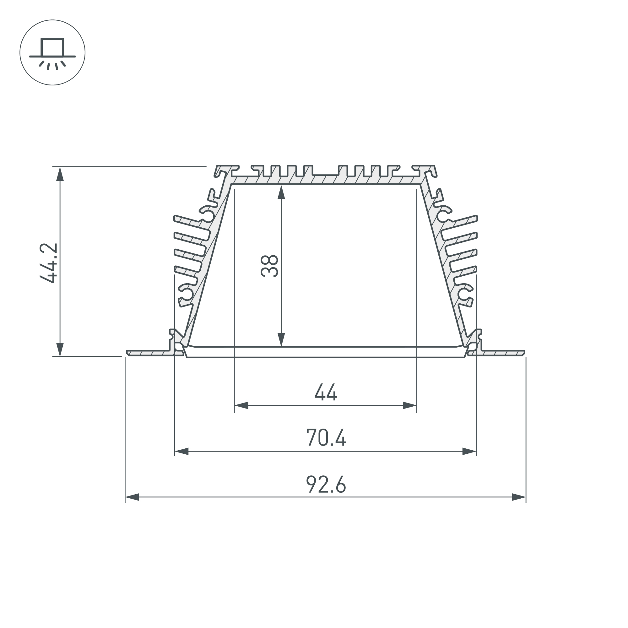 Габаритные размеры профиля составляют 2000 мм в длину, 92,6 мм в ширину и 44,2 мм в высоту. Площадка для установки светодиодных лент позволяет использовать ленту шириной до 44 мм и мощностью до 63,8 Вт/м. Это обеспечивает гибкость в выборе светодиодных лент и создает потрясающие световые решения.