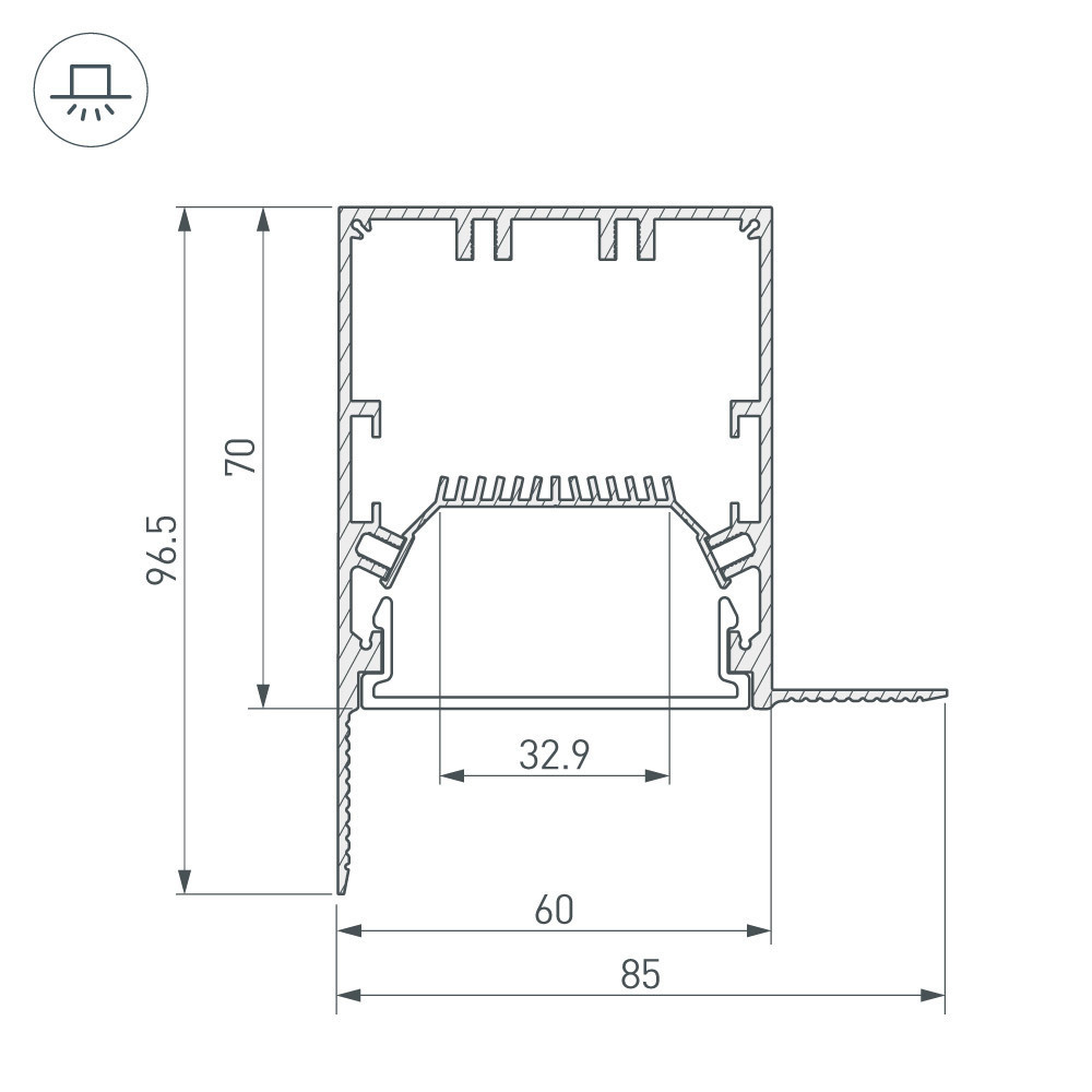 Отсек для блока питания (48х36 мм) и съемная площадка для светодиодной ленты значительно облегчают сервисное обслуживание осветительного оборудования. Габаритные размеры профиля составляют 2000 мм в длину, 85 мм в ширину и 96,5 мм в высоту. Площадка для установки светодиодных лент позволяет использовать ленту шириной до 32 мм и мощностью до 29 Вт/м. Это обеспечивает гибкость в выборе светодиодных лент и создает потрясающие световые решения.
