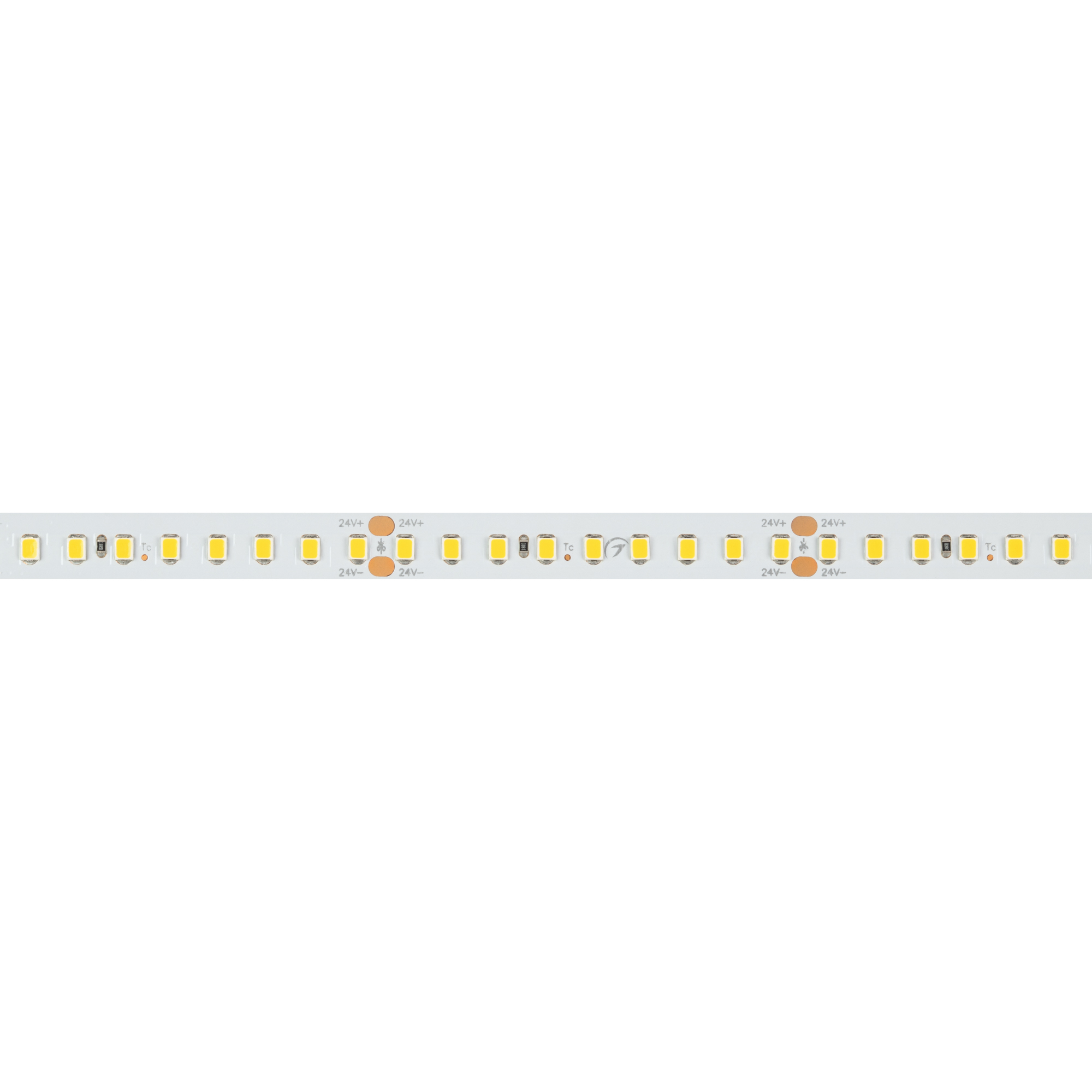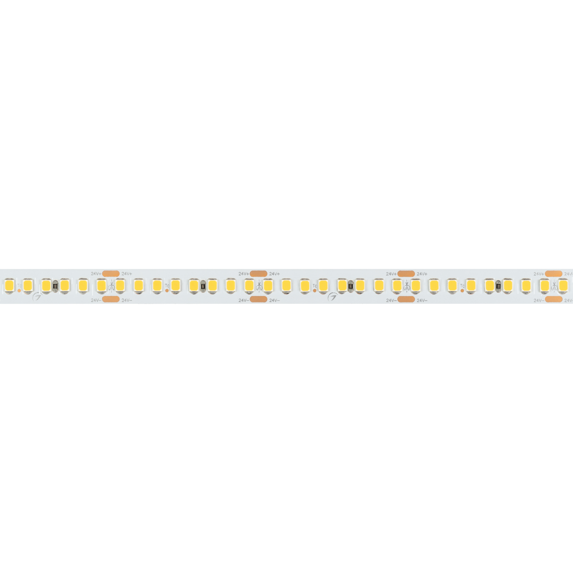 Светодиодная высокоэффективная лента RT серии A192. Светодиоды SMD 2835, 192 шт/м, белая плата шириной 10 мм, скотч 3M. Цвет ТЕПЛЫЙ 3500K, высокая световая эффективность 150 лм/Вт, индекс цветопередачи CRI>85, угол 120°. Питание 24 В, мощность 17.6 Вт/м (88 Вт на 5 м). Размеры 5000x10x1.6 мм. Мин. отрезок 41.67 мм, 8 светодиодов. Цена за 1 м. Обязательна установка на профиль.