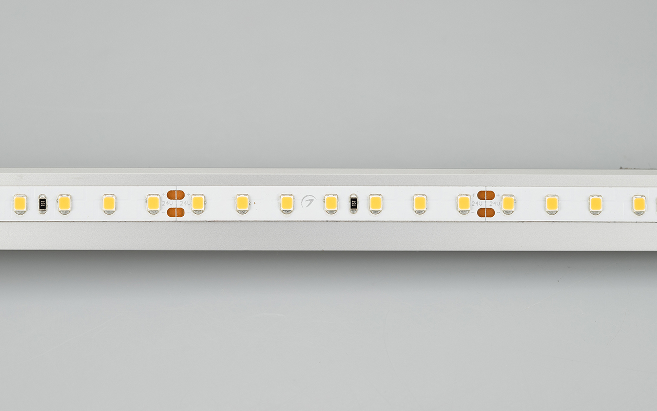 Открытая светодиодная лента шириной 8 мм и мощностью 10 Вт/м с очень высоким индексом цветопередачи CRI>95. Светодиоды SMD 2835 (98 шт/м) белого теплого цвета свечения (2900–3100 К). Напряжение питания 24 В. Минимальный отрезок 71.43 мм (7 светодиодов). Для организации освещения в помещениях с повышенными требованиями к качеству света: учебные заведения, музеи, шоурумы и другие помещения.