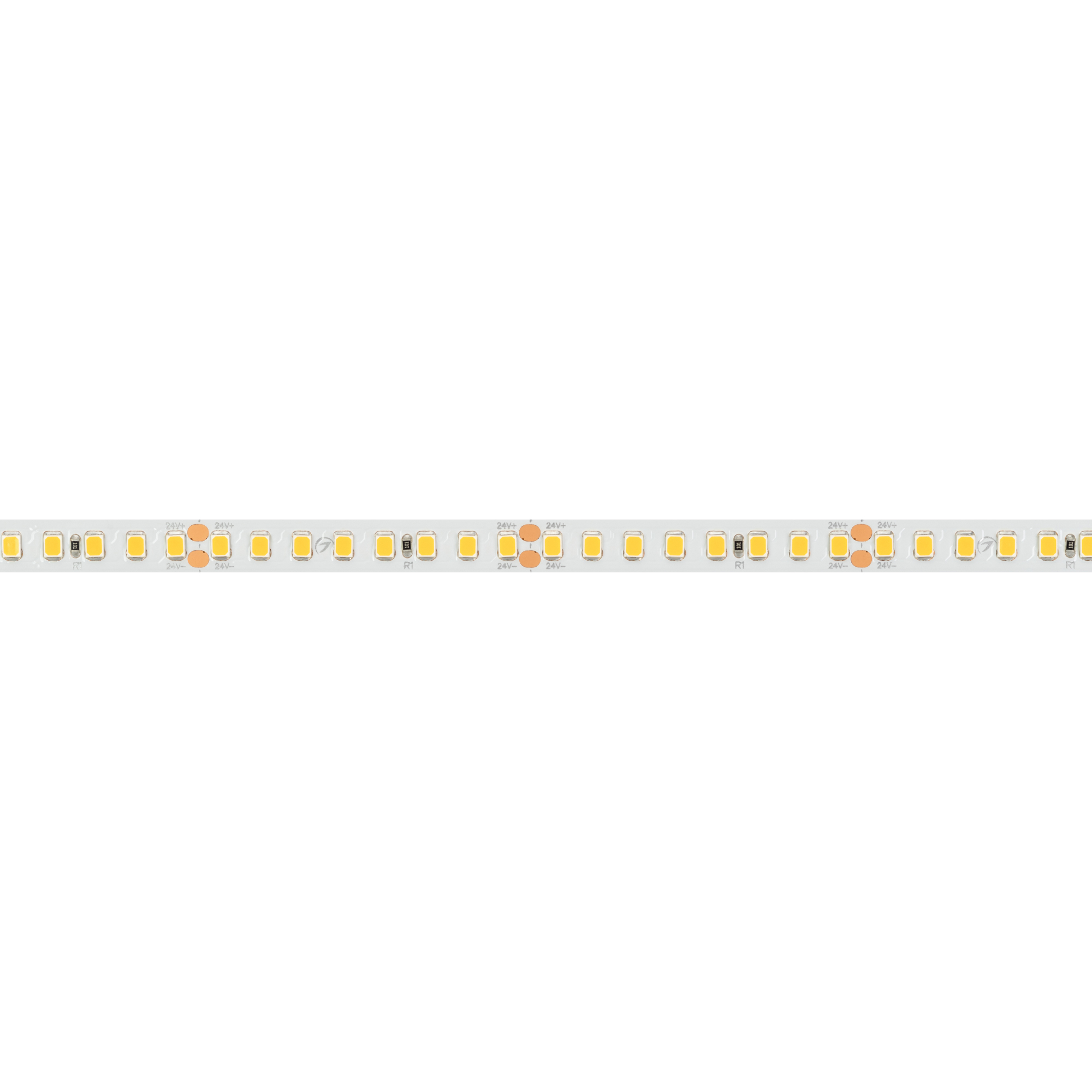 Светодиодная высокоэффективная лента RT серии A160. Светодиоды SMD 2835, 160 шт/м, белая плата шириной 8 мм, скотч 3M. Цвет ТЕПЛЫЙ 2400K, высокая световая эффективность 150 лм/Вт, индекс цветопередачи CRI>85, угол 120°. Питание 24 В, мощность 12 Вт/м (60 Вт на 5 м). Размеры 5000x8x1.5 мм. Мин. отрезок 50 мм, 8 светодиодов. Цена за 1 м.