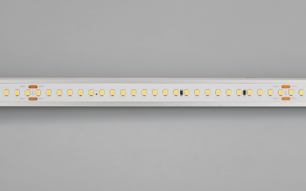 Стабилизированная светодиодная лента IC серии A144 шириной 12 мм, мощностью 5.8 Вт/м, с подключением до 50 м. Стабилизаторы тока обеспечивают равномерное свечение теплый цвета (3000K) по всей длине при подключении с одной стороны. Напряжение питания 48 В. Светодиоды SMD 2835, 144 шт/м. Индекс цветопередачи CRI>80. Минимальный отрезок 166.67 мм (24 светодиодов). Лента совместима с любыми диммерами ШИМ. Применяется для декоративной подсветки потолочных ниш, создания длинных непрерывных световых линий, контуров рекламных объектов.