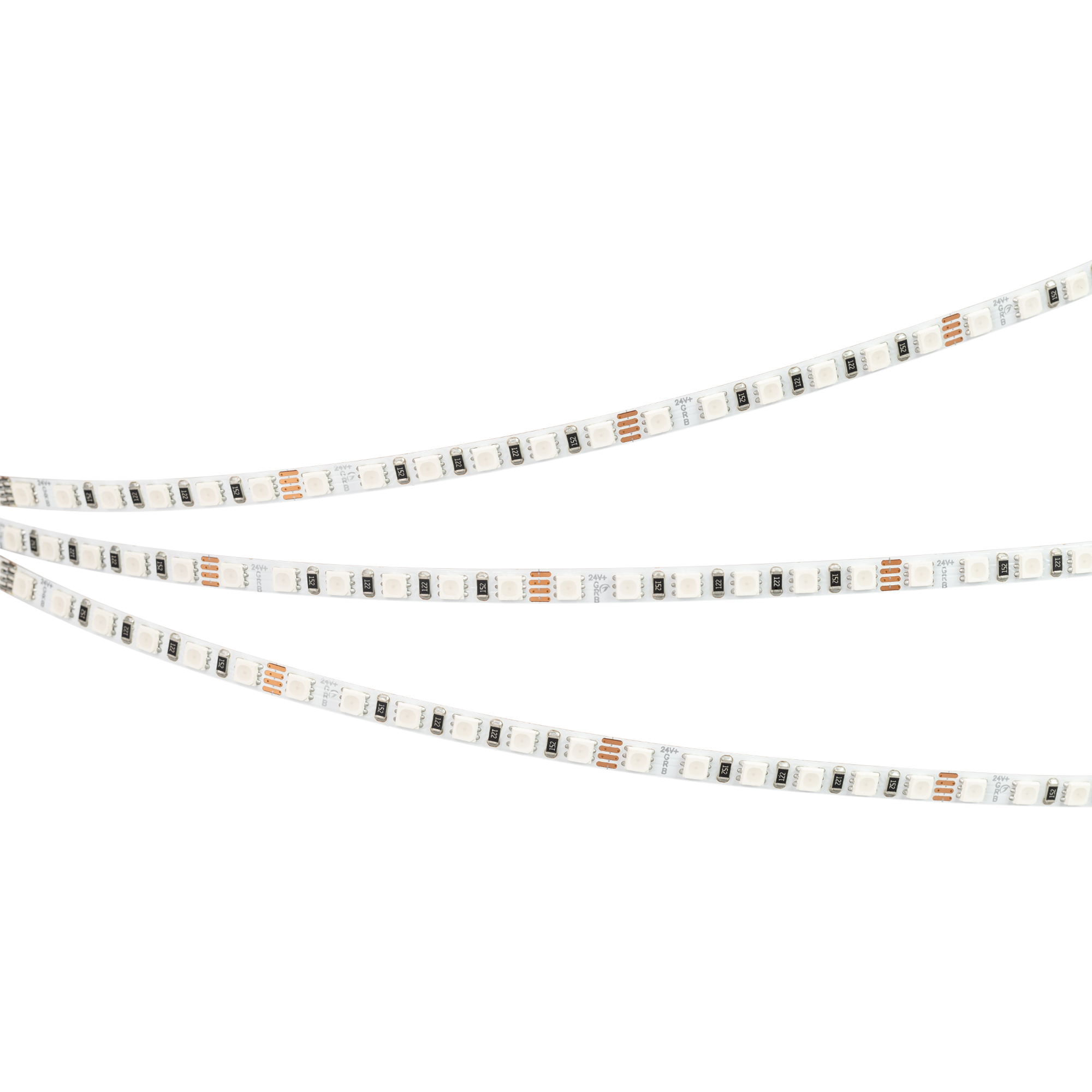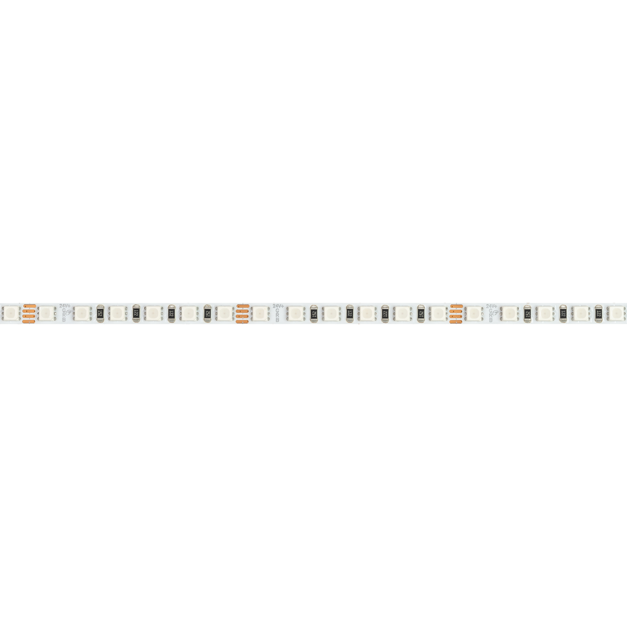 Мультицветная лента серии RT G120. Светодиоды SMD 3838, 120 шт/м, белая плата шириной 5 мм, скотч 3M. Цвет RGB. Питание 24 В, мощность 7.5 Вт/м (37.5 Вт на 5 м), угол 120°. Размеры 5000x5x1.9 мм. Мин. отрезок 50 мм, 6 светодиодов. Цена за 1 м.