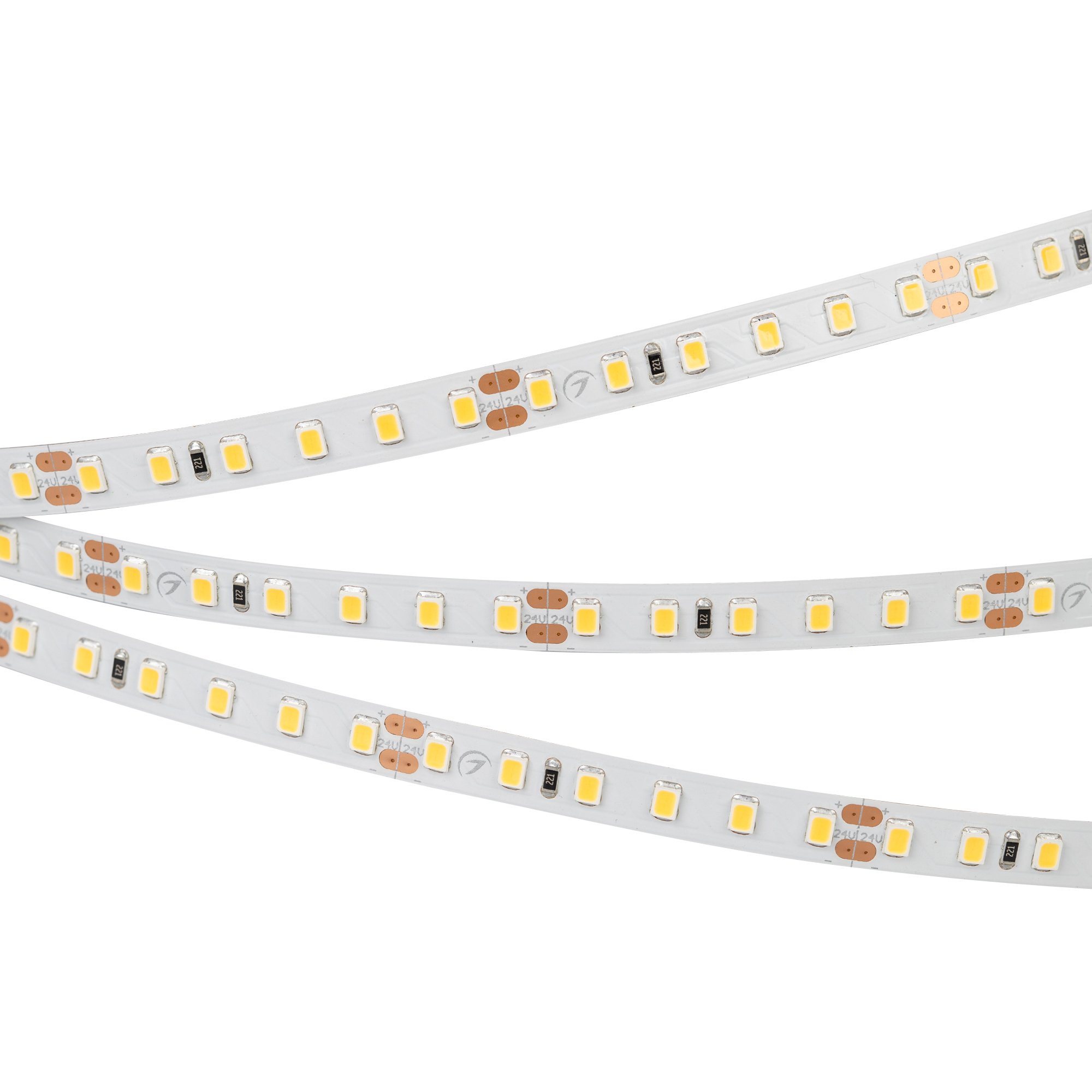 Светодиодная лента RT серии A120 (монтажная бобина 50 м). Светодиоды SMD 2835, 120 шт/м, белая плата шириной 8 мм, скотч 3M. Цвет ТЕПЛЫЙ 2700K, индекс цветопередачи CRI>85, угол 120°. Питание 24 В, мощность 9.6 Вт/м (480 Вт на 50 м). Размеры 50000x8x1.5 мм. Мин. отрезок 50 мм, 6 светодиодов. Цена за 1 м. Разрезать перед подключением. Макс. длина подключения 5 м. Рекомендуется установка на профиль.