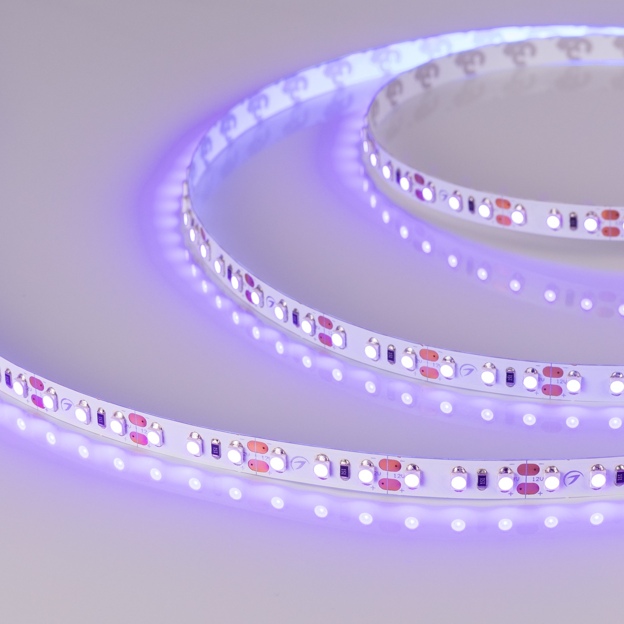 Ультрафиолетовая светодиодная лента RT серии A120 шириной 8 мм, мощностью 9.6 Вт/м. Напряжение питания 12 В. Светодиоды SMD 2835, 60 шт/м, безопасного ультрафиолетового излучения (400 нм). Минимальный отрезок 25 мм (3 светодиода). Применяется для облучения элементов ультрафиолетом, при котором белые детали начинают светиться. Предназначена для декоративной подсветки зон отдыха, танцевальных площадок, клубов.