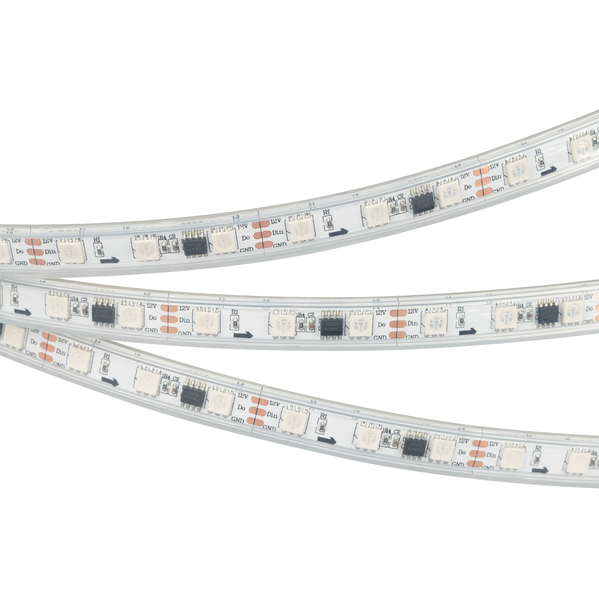 Светодиодная герметичная лента SPI серии B60 с микросхемой 16703, IP66 (P - силиконовая трубка). Светодиоды SMD 5060, 60 шт/м, 20 pixels на 1 м (100 pixels на 5 м), 1 pixel = 3 светодиода, белая плата шириной 10 мм, скотч 3М. Цвет RGB, угол 120°. Питание 12 В, мощность 14.4 Вт/м (72 Вт на 5 м). Размеры 5000x12x4.5 мм. Мин. отрезок 50 мм, 3 светодиода. Цена за 1 м.