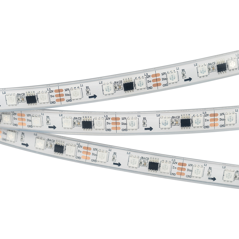 Светодиодная герметичная лента SPI серии B60 с микросхемой 16703, IP68 (PFS - полная силиконовая экструзия). Светодиоды SMD 5060, 60 шт/м, 20 pixels на 1 м (100 pixels на 5 м), 1 pixel = 3 светодиода, белая плата шириной 10 мм, скотч 3М. Цвет RGB, угол 120°. Питание 12 В, мощность 14.4 Вт/м (72 Вт на 5 м). Размеры 5000x12x5 мм. Мин. отрезок 50 мм, 3 светодиода. Цена за 1 м.