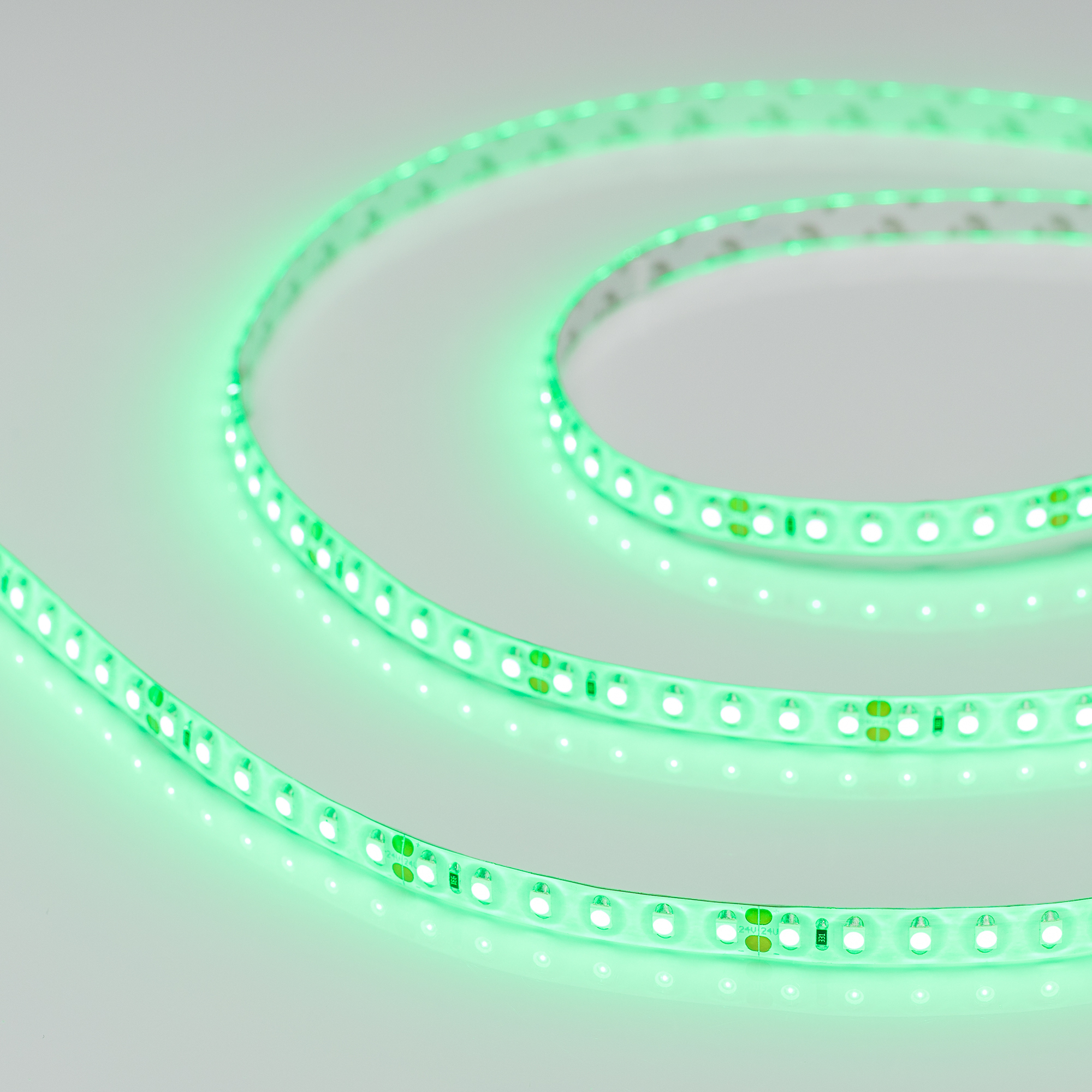 Светодиодная герметичная лента RTW серии A120 шириной 8 мм, мощностью 9.6 Вт/м, степень защиты IP65. Напряжение питания 24 В. Светодиоды SMD 2835, 120 шт/м, зеленого цвета свечения. Минимальный отрезок 50 мм (6 светодиодов). Применяется для декоративной подсветки любых жилых, коммерческих помещений, декоративной подсветки интерьеров, потолочных ниш, рабочих зон кухни, влажных зон, рекламы и витрин.