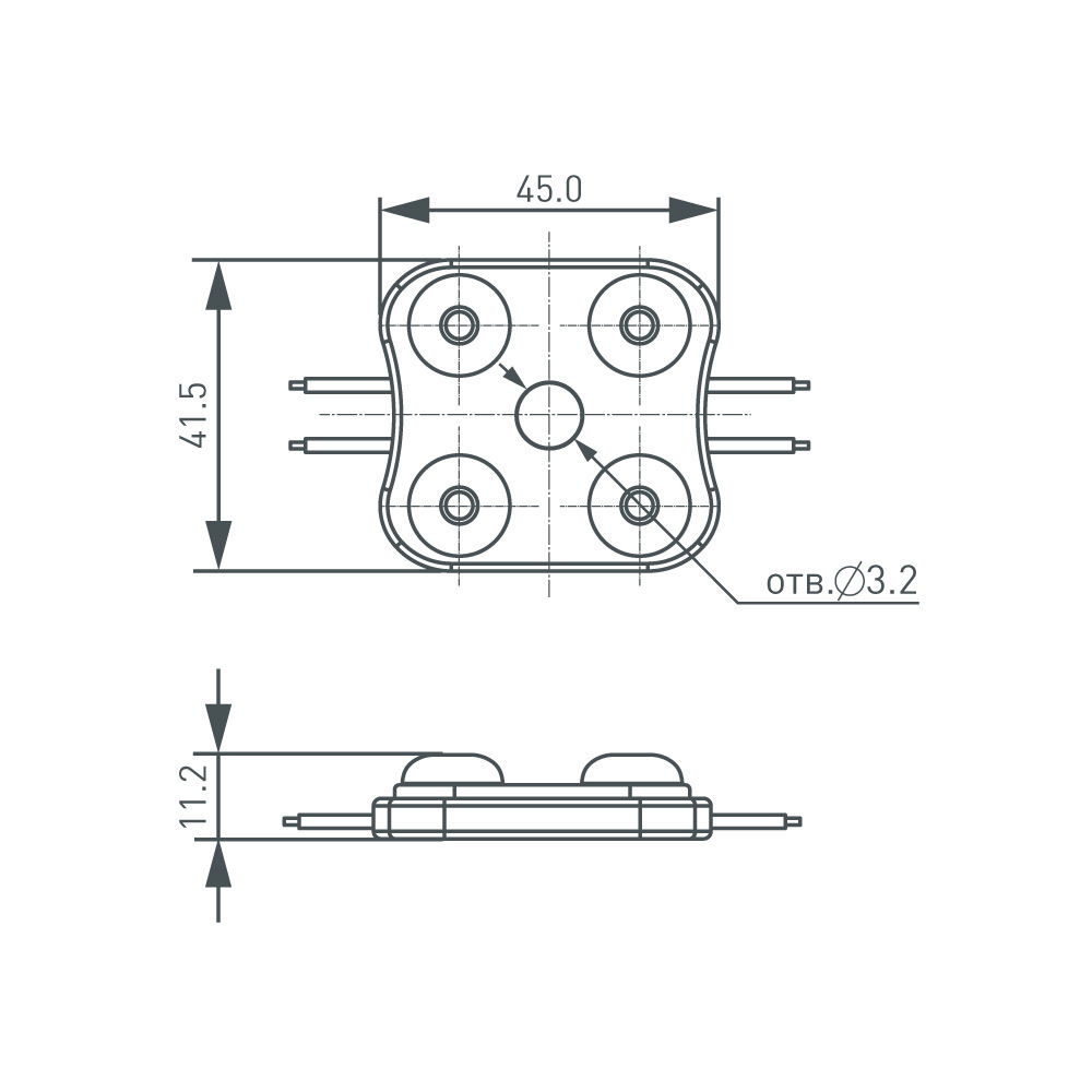 Герметичный светодиодный модуль IP67, ХОЛОДНЫЙ 7500–8000 К, напряжение 12 В, мощность 1.2 Вт, св. поток 180 лм, 3 светодиода SMD 2835, угол 170°. 20 шт на проводе, расстояние между центрами модулей 255 мм, длина провода между модулями 210 мм, рекомендуемая глубина установки 120–300 мм. Размер 45х41.5х11.2 мм. Гарантия 5 лет.