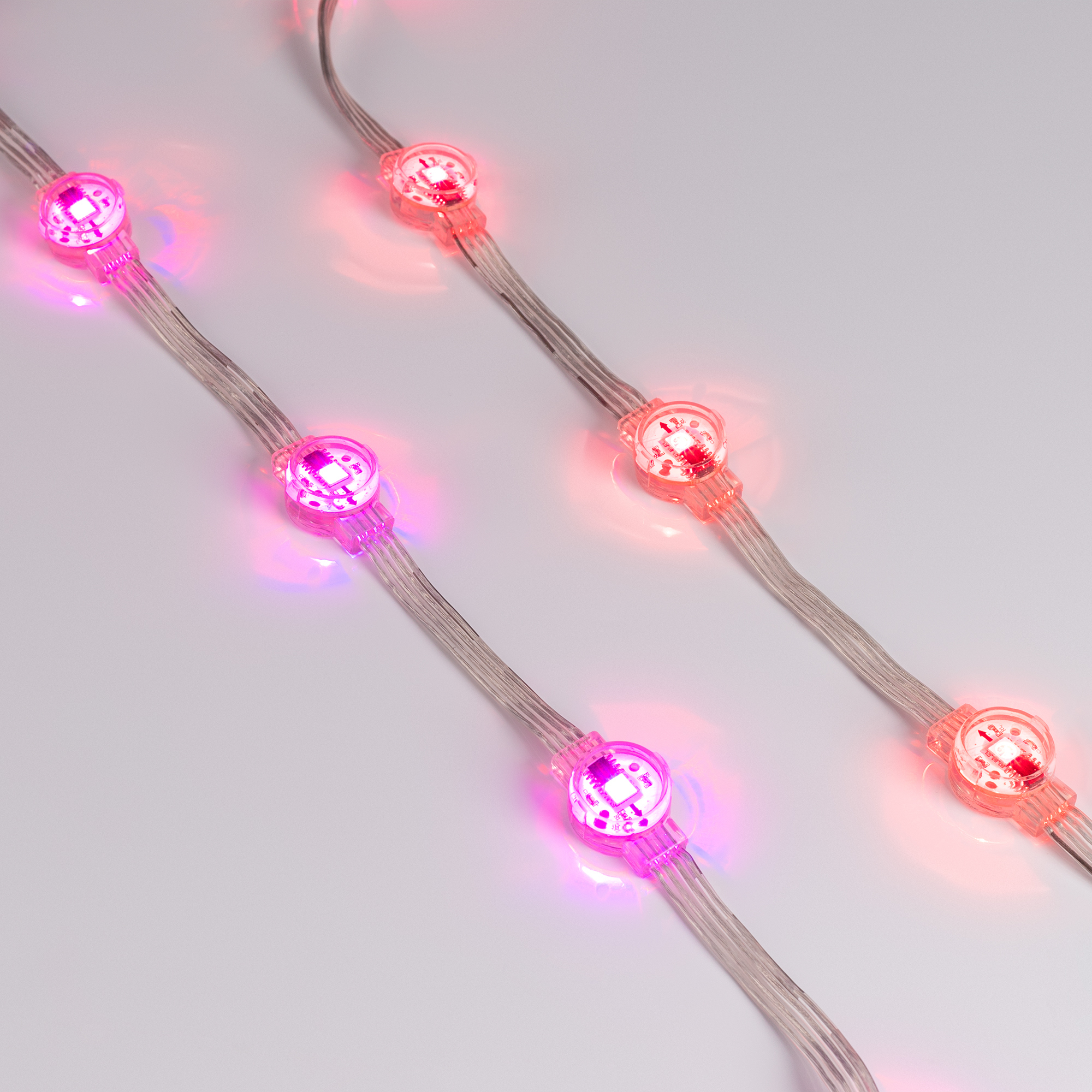 Управляемый светодиодный модуль DMX, RGB, микросхема GS8512, напряжение 12 В, мощность 0.3 Вт, 1 светодиод SMD 5060, угол 120°. Создание медиафасадов, 20 шт на проводе, расстояние между центрами модулей 105 мм, длина провода между модулями 75 мм. Степень пылевлагозащиты IP68. Размер Ø20×12 мм. Гарантия 3 года.