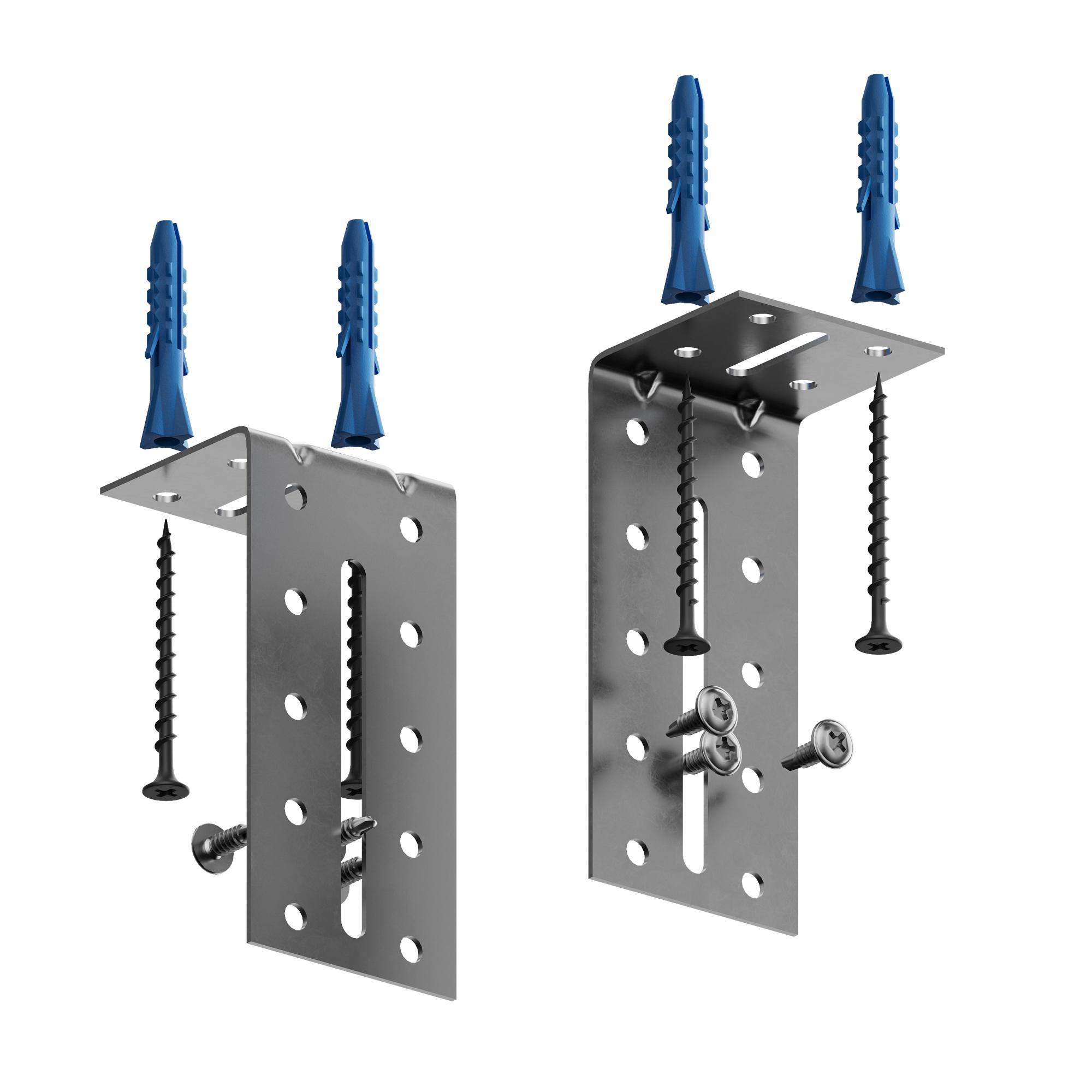 Комплект регулируемых монтажных уголков HSBL_0211 (2 шт.) предназначен для надёжной фиксации закладных профилей под натяжной потолок. Цвет — серебристый, материал — металл с матовой поверхностью. Уголки обеспечивают точную установку и устойчивость конструкции. Габариты: 40×2×85 мм. Арматура — металлическая, серебристого цвета.