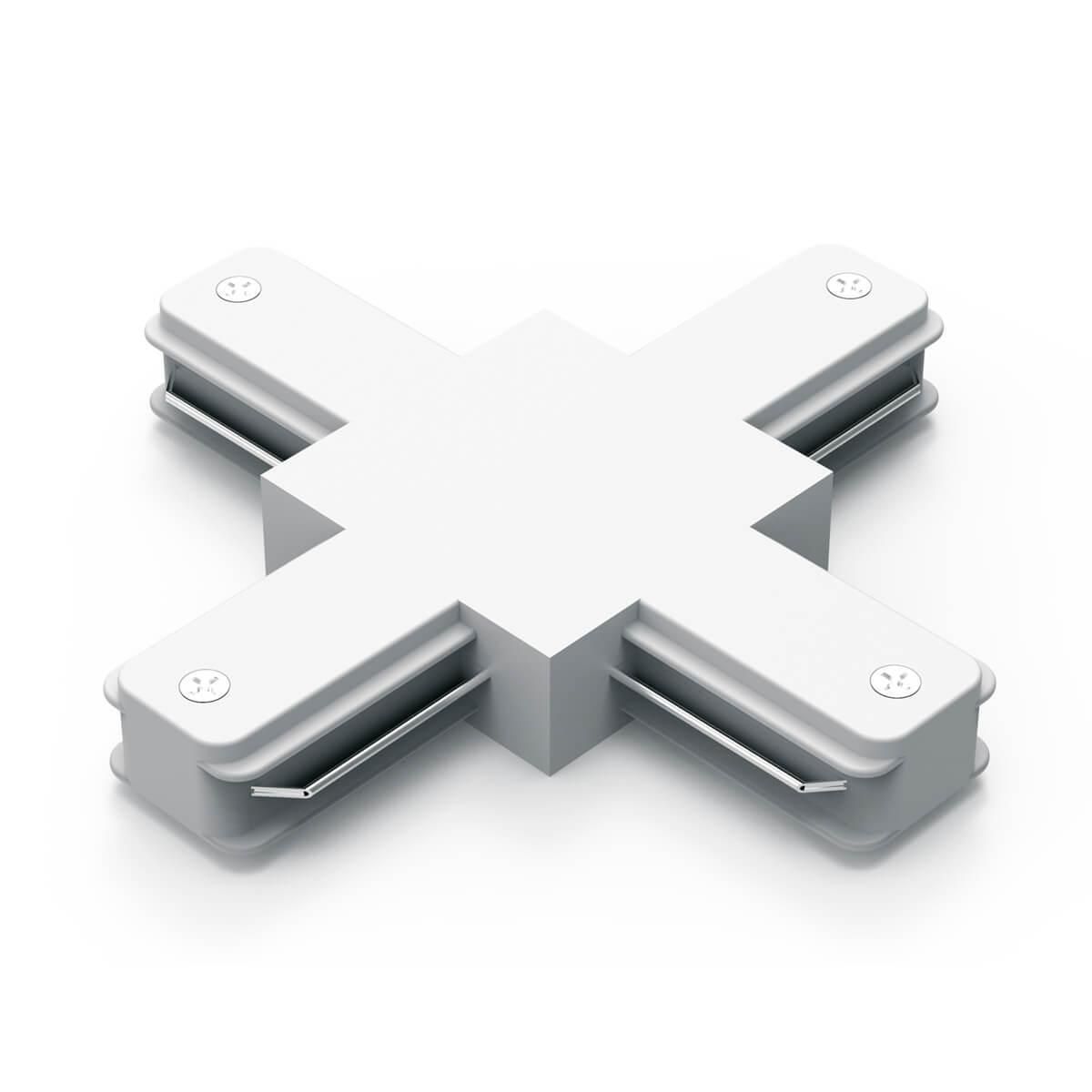 Крестообразный коннектор для соединения шинопроводов. Без возможности подвода питания. С помощью коннекторов из шинопроводов можно собрать трековую систему любой конфигурации.