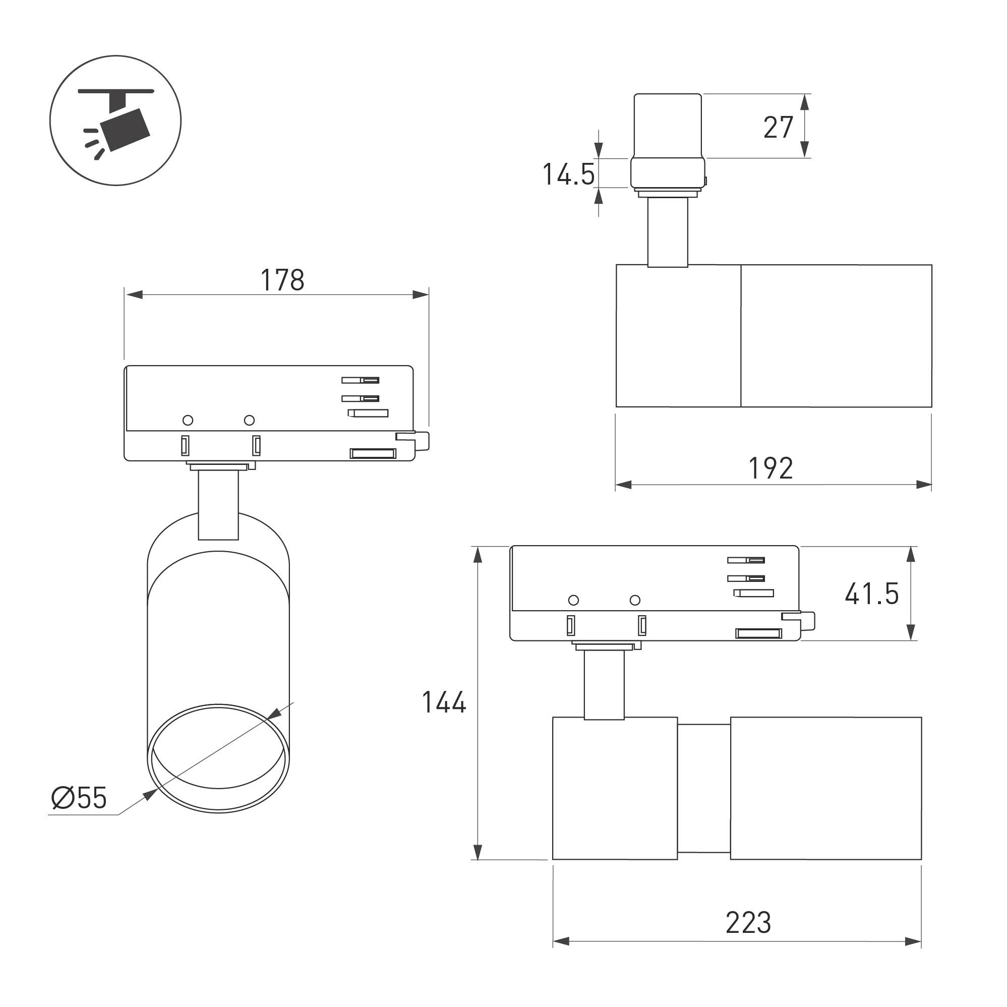 Светильник для треков/шин 4 провода с управлением DALI, Мощность 12Вт. Цвет свечения дневной 4000K, световой поток 721 лм, 65 лм/Вт, регулируемый угол 8-80°, CRI>90. Корпус круглый, алюминий, цвет белый, IP20. Размеры L × W × H (Ø) 192 х 144 х Ø55 мм. Входное напряжение AC220-240V. Монтаж на трек 3-фазный. Драйвер 10-42В (300-800 мА), 50/60Гц, максимальная мощность 42W