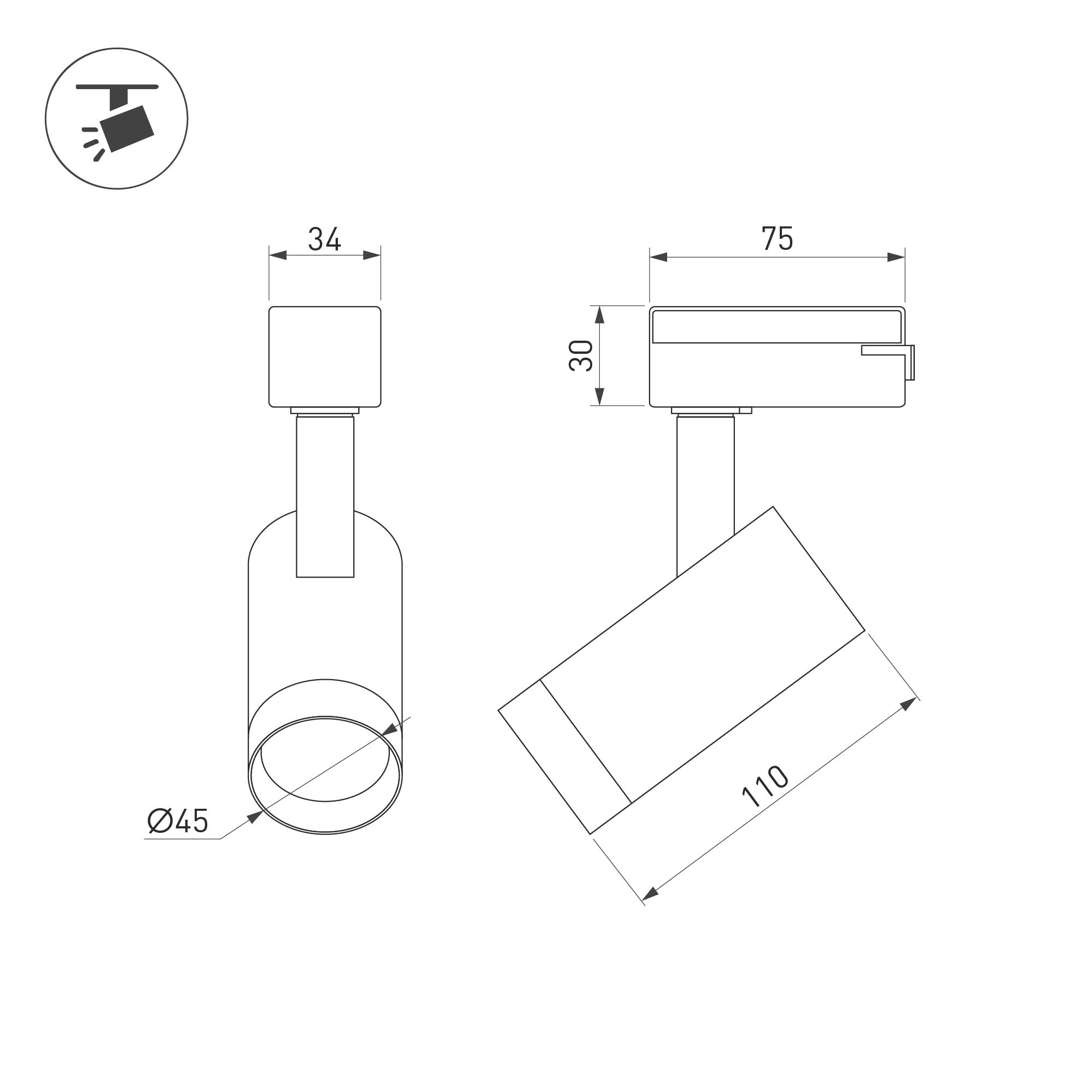 Светильник для треков/шин 2 провода. Мощность 7 Вт, св. поток 540 лм, 77 лм/Вт, теплый 3000 K, CRI>94, угол 24°, напряжение питания 230 В. Белый круглый корпус из алюминия, материал линзы PMMA , степень защиты IP20. Размер: диаметр 45 мм, высота 165 мм. Монтаж на трек 1-фазный. Драйвер встроенный 8.5-40 В, 150 мА., пульсация <2%.