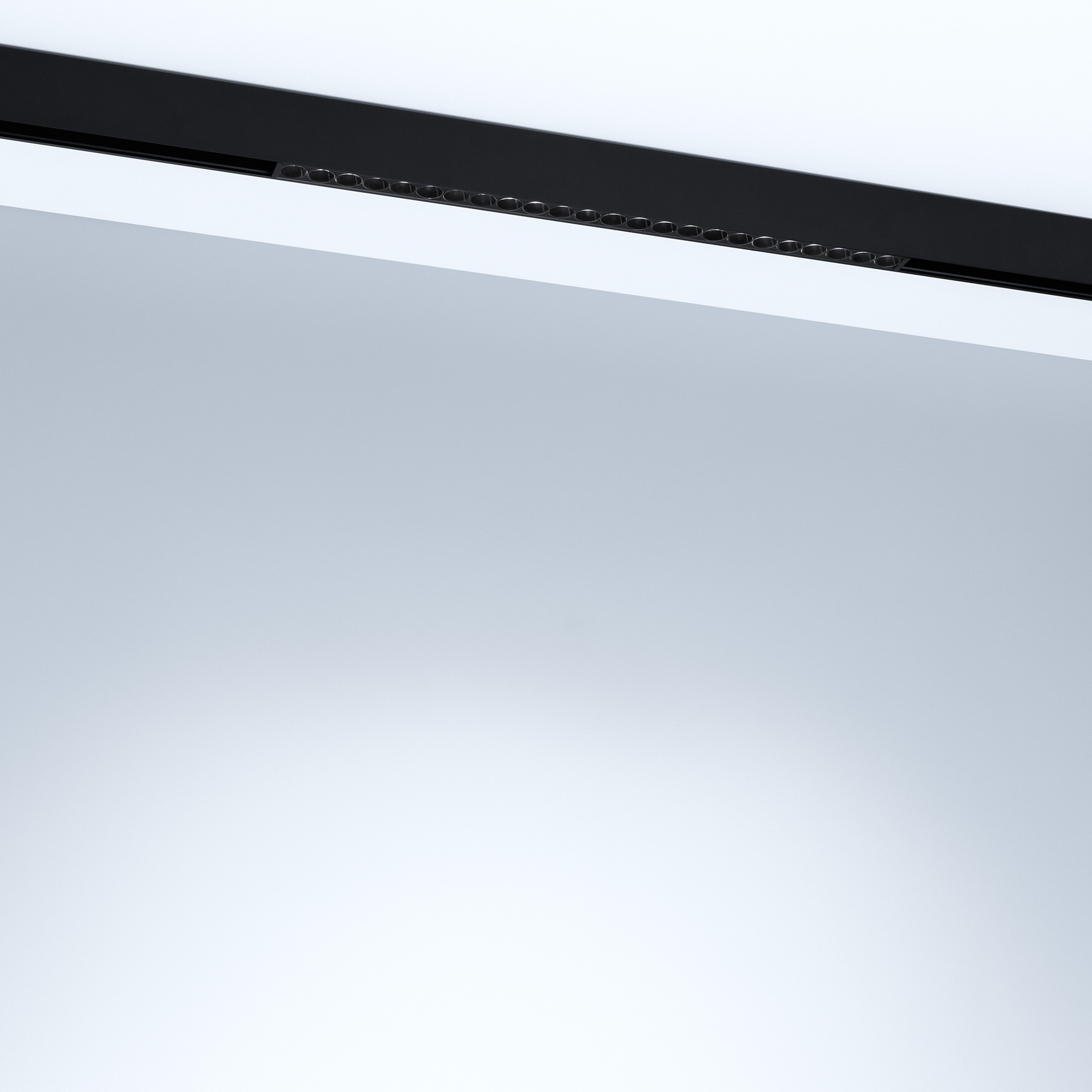 Светильник для магнитных треков MAG-ORIENT шириной 26 мм с управлением TUYA (Wi-Fi) и изменяемой цветовой температурой. Мощность 16 Вт, св. поток 930-1200 лм, 58-75 лм/Вт, изменяемая цветовая температура 2700-6500 K, CRI>90, угол 24°, напряжение питания 48 В. Черный прямоугольный корпус из металл, экран поликарбонат, степень защиты IP20. Размер: длина 462 мм, ширина 22 мм, высота 42 мм. Монтаж на трек MAG-ORIENT. Пульсация <1%. Работает с голосовыми помощниками (Алиса, Маруся и т.д.)