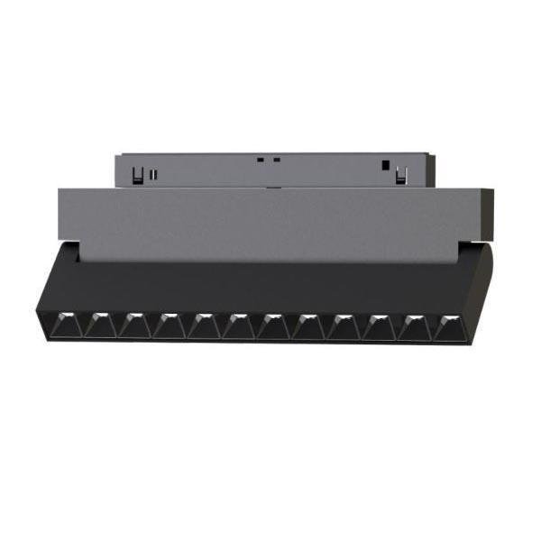 Светильник для магнитных треков MAG-ORIENT шириной 26 мм с управлением DALI. Мощность 12 Вт, св. поток 520 лм, 43 лм/Вт, теплый 3000 K, CRI>90, угол 30°, напряжение питания 48 В. Черный прямоугольный корпус из металл, экран поликарбонат, степень защиты IP20. Размер: длина 231 мм, ширина 23 мм, высота 107 мм. Монтаж на трек MAG-ORIENT. Пульсация <1%.