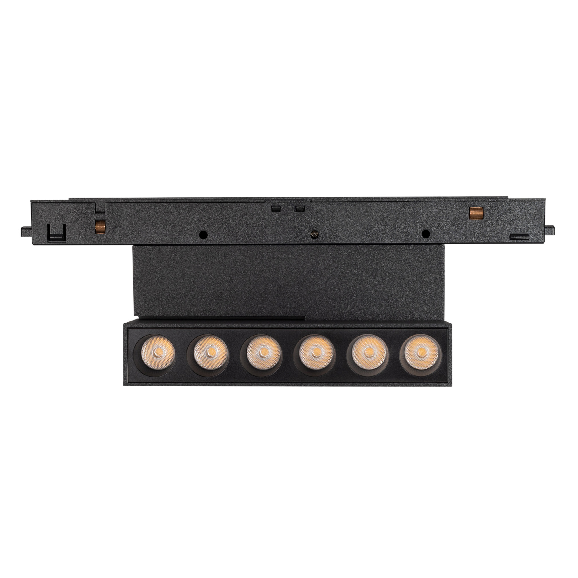 Светильник для магнитных треков MAG-ORIENT шириной 26 мм с управлением DALI. Мощность 6 Вт, св. поток 490 лм, 82 лм/Вт, теплый 3000 K, CRI>90, угол 30°, напряжение питания 48 В. Черный прямоугольный корпус из металл, экран поликарбонат, степень защиты IP20. Размер: длина 204 мм, ширина 23 мм, высота 99 мм. Монтаж на трек MAG-ORIENT. Пульсация <1%.