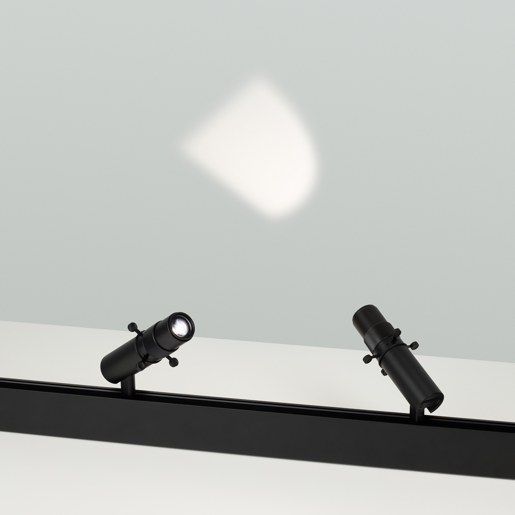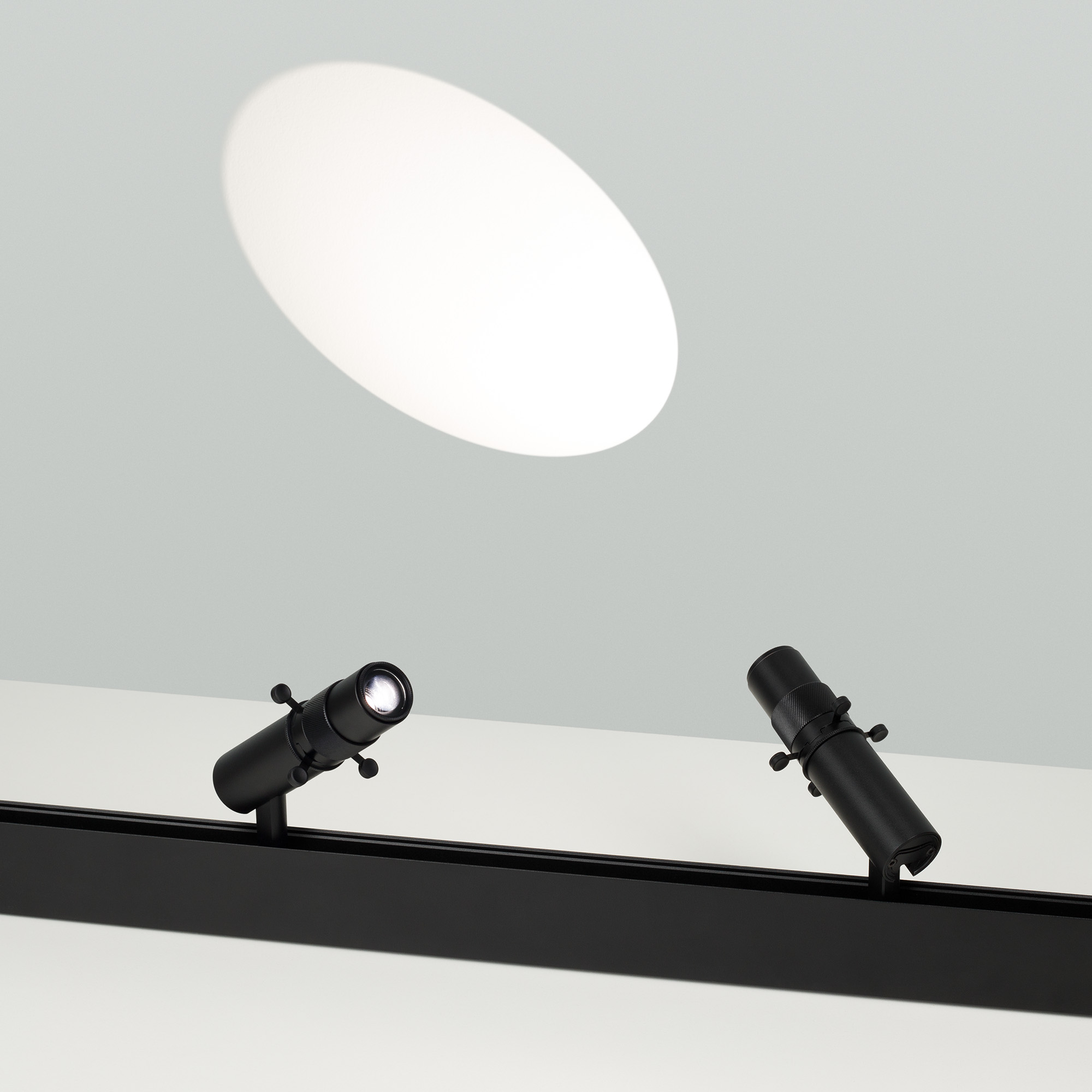 Светильник с кадрируемой оптикой и изменяемым углом для магнитных треков MAG-ORIENT шириной 26 мм. Мощность 6 Вт, св. поток 75-130 лм, 22 лм/Вт, дневной 4000 K, CRI>98, угол 19-29°, напряжение питания 48 В. Черный фигурный корпус из металла, степень защиты IP20. Размеры LxWxH 126x35x195 мм. Длина светоизлучающего модуля 140мм. Монтаж на трек MAG-ORIENT. Пульсация <1%.