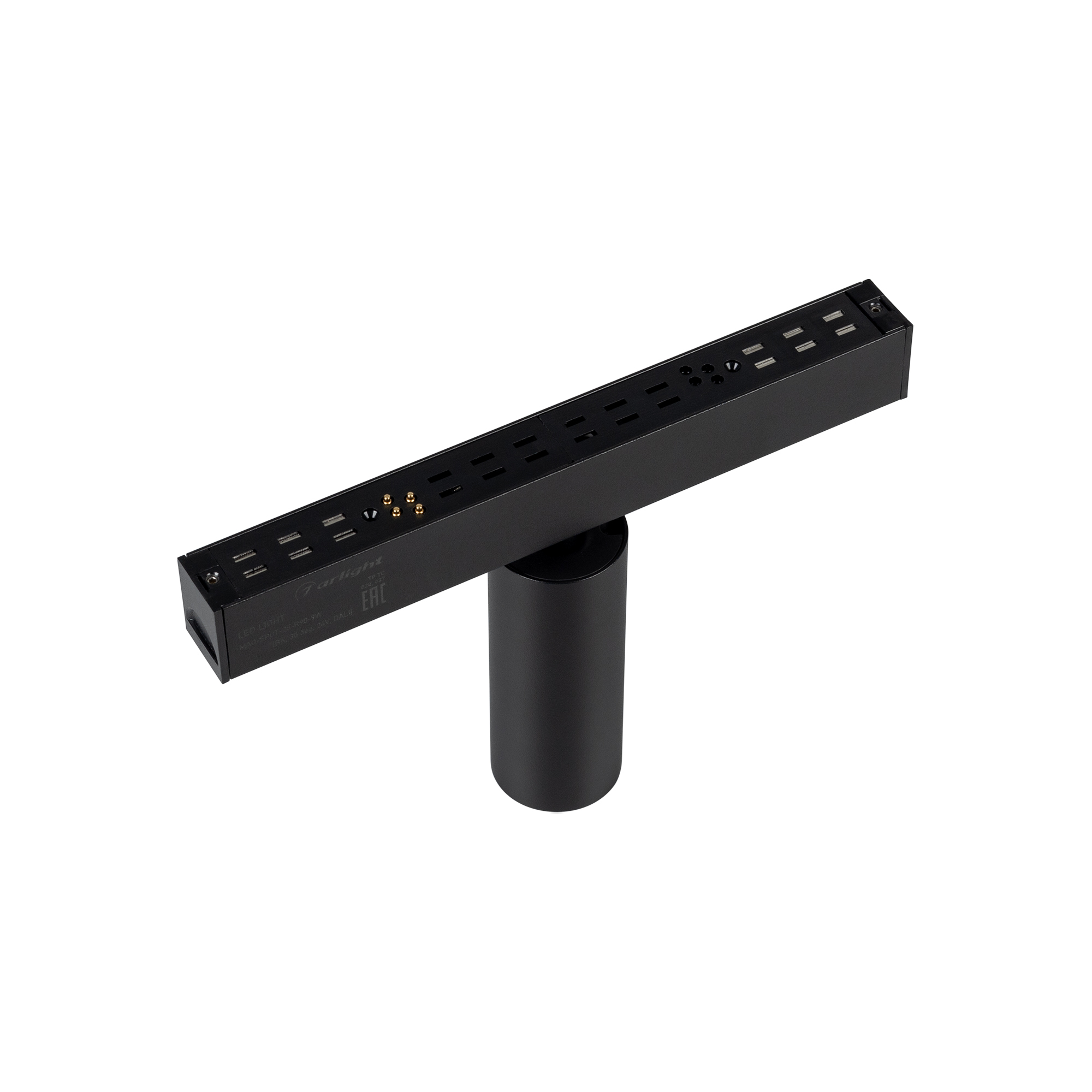 Светильник поворотный для магнитных треков шириной 25 мм с управлением DALI, мощность 9 Вт. Цвет свечения ТЕПЛЫЙ 3000K, световой поток 630 лм, угол 30°, CRI>90. Корпус прямоугольный, металл, цвет черный, IP20. Размеры LxWxH 100x35x90 мм. Входное напряжение DC24V, мощность 9 Вт. Драйвер AС230V/DC24V поставляется отдельно. Диаметр светоизлучающего модуля 35 мм.