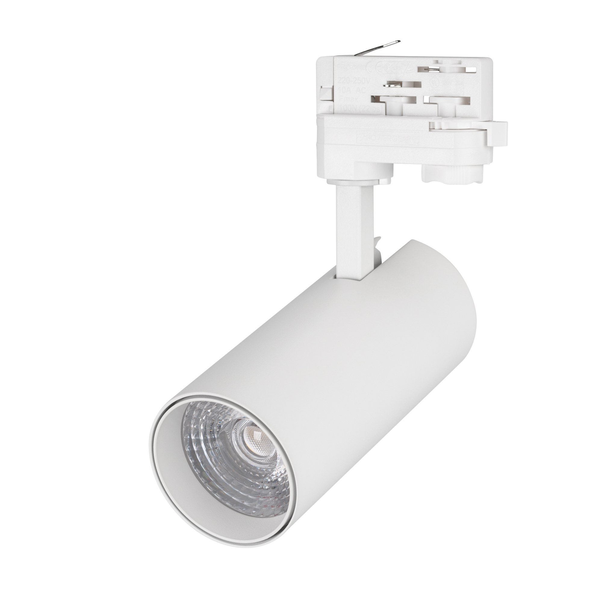 Светильник для треков/шин 4 провода с управлением DALI. Мощность 20Вт, св. поток 1800-2200лм, 90 лм/Вт, дневной 4000 К, угол 24°, CRI>90, напряжение питания 230 В. Белый круглый корпус из алюминия, материал линзы PC/PMMA , степень защиты IP20. Размер: диаметр 74 мм, высота 160 мм. Монтаж на трек 3-фазный. Драйвер встроенный 30-42 В, 500 мА., пульсация <5%.