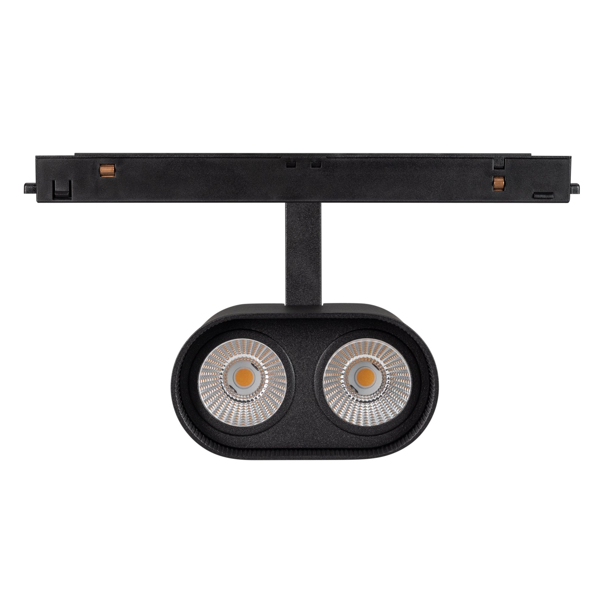 Светильник для магнитных треков MAG-ORIENT шириной 26 мм. Мощность 12 Вт, св. поток 900лм, 75 лм/Вт, теплый 3000 K, CRI>90, угол 40°, напряжение питания 48 В. Черный фигурный корпус из металл, экран поликарбонат, степень защиты IP20.Размеры LxWxH 204x89x140 мм. Монтаж на трек MAG-ORIENT. Пульсация <1%.