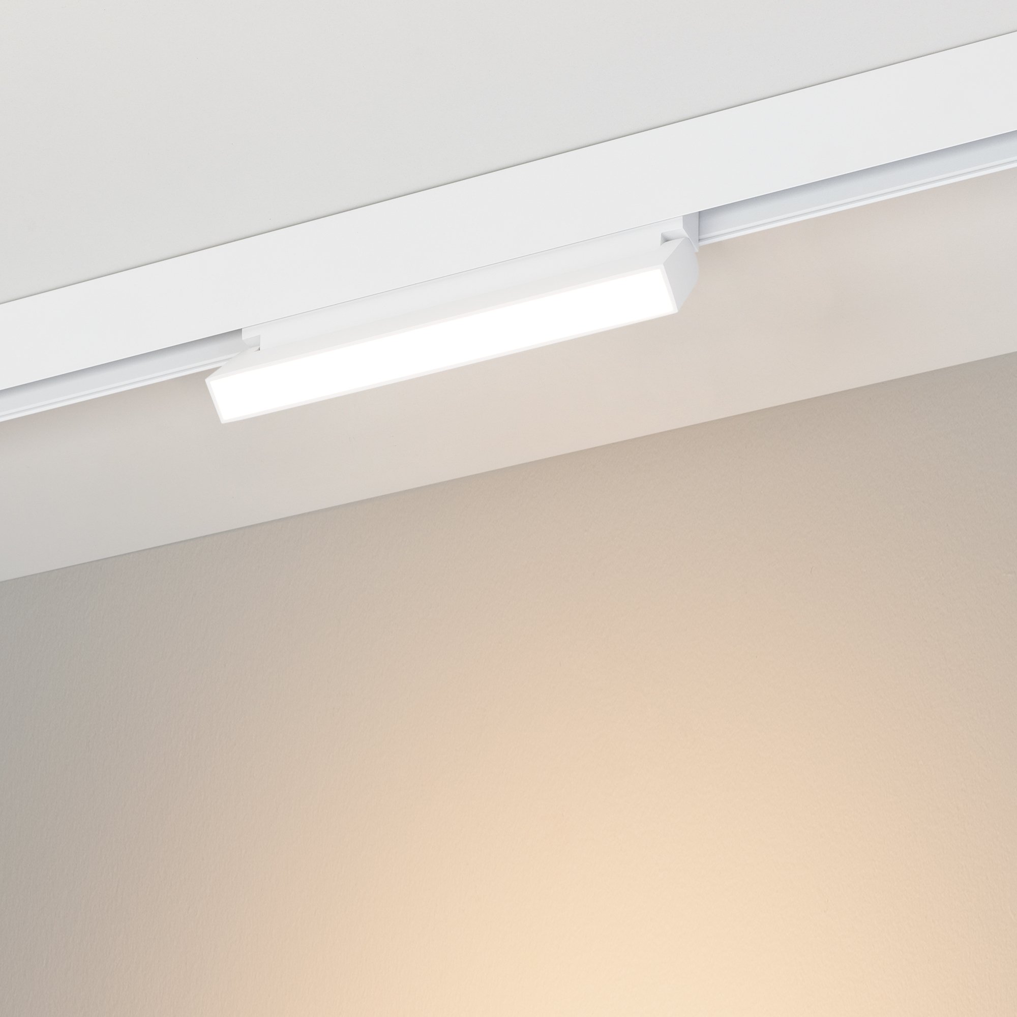 Светильник для магнитных треков MAG-ORIENT шириной 26 мм. Мощность 12 Вт, св. поток 750 лм, 60 лм/Вт, теплый 3000 K, CRI>90, угол 80°, напряжение питания 48 В. Белый прямоугольный корпус из металл, экран поликарбонат, степень защиты IP20. Размер: длина 232 мм, ширина 23 мм, высота 99 мм. Монтаж на трек MAG-ORIENT. Пульсация <1%.
