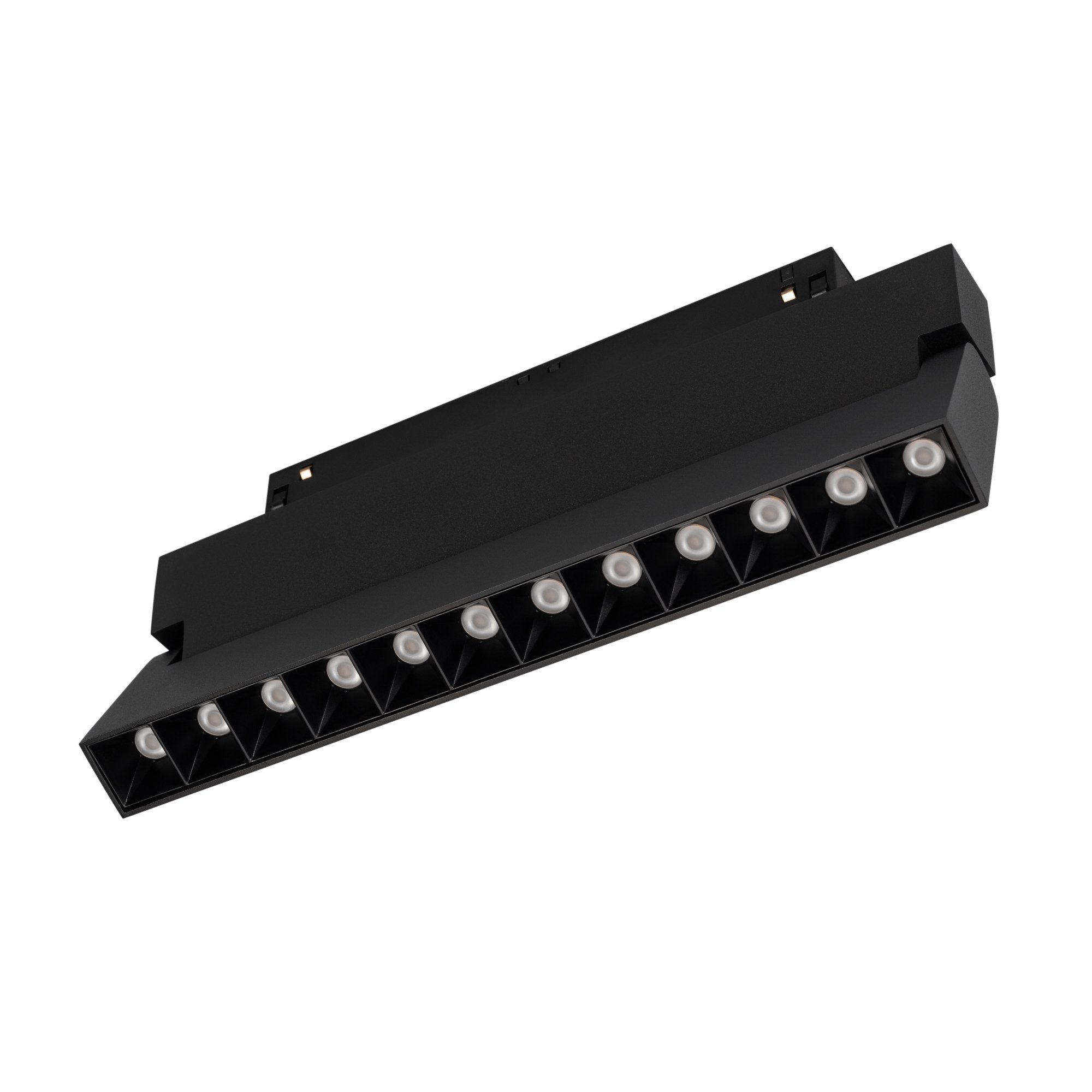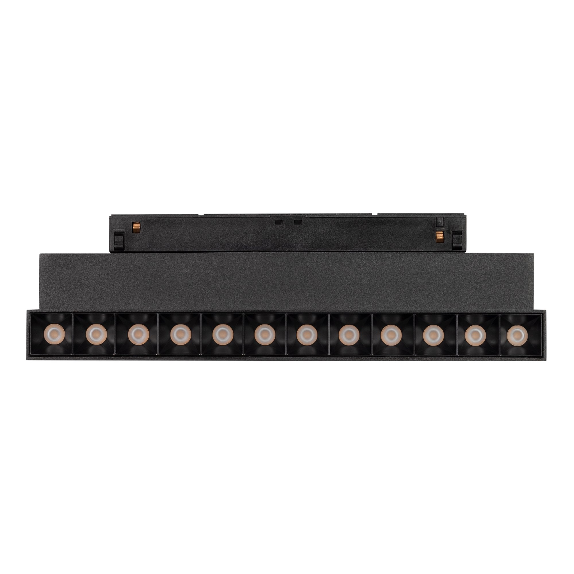 Светильник для магнитных треков MAG-ORIENT шириной 26 мм. Мощность 12 Вт, св. поток 520 лм, 43 лм/Вт, теплый 3000 K, CRI>90, угол 30°, напряжение питания 48 В. Черный прямоугольный корпус из металл, экран поликарбонат, степень защиты IP20. Размер: длина 232 мм, ширина 23 мм, высота 99 мм. Монтаж на трек MAG-ORIENT. Пульсация <1%.