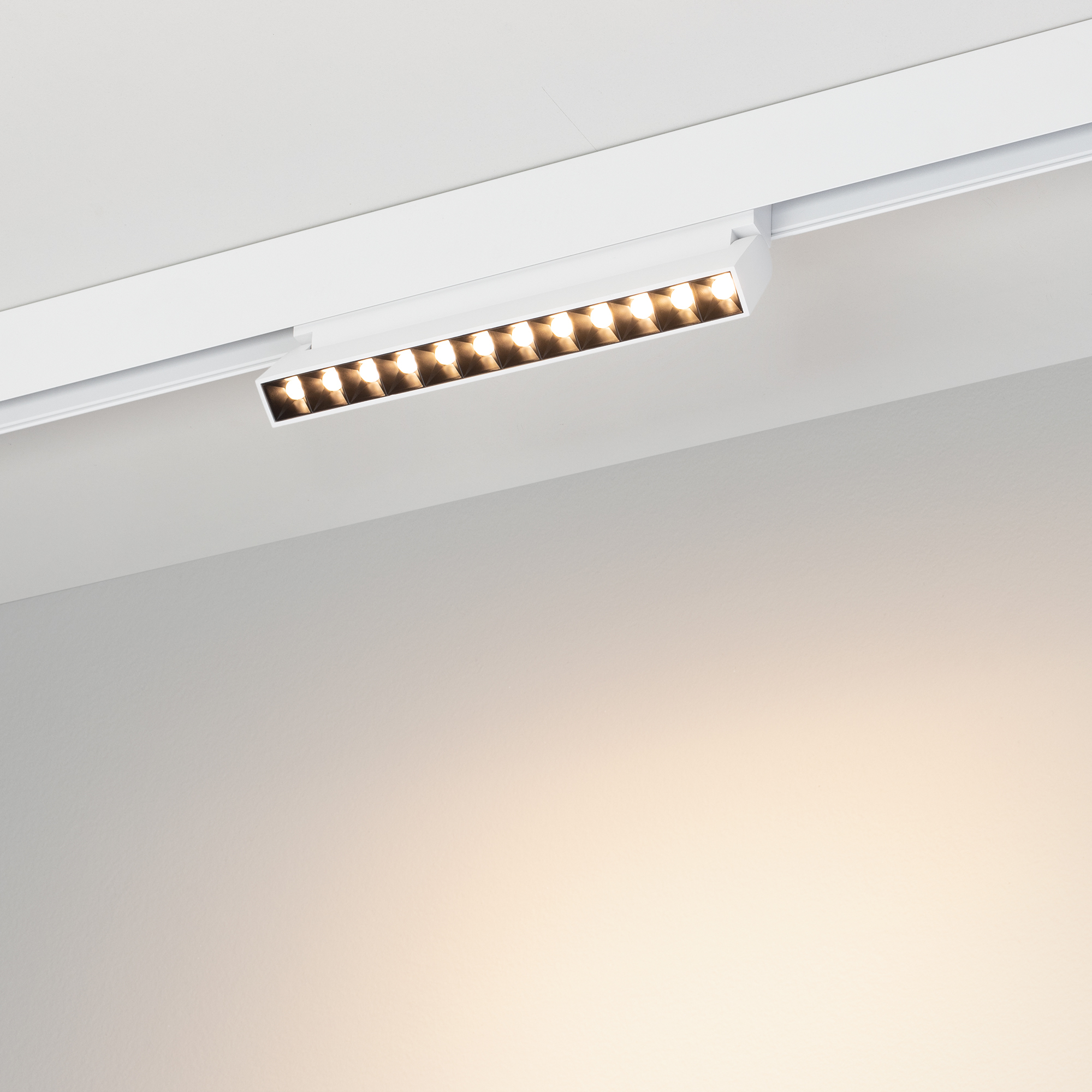 Светильник для магнитных треков MAG-ORIENT шириной 26 мм. Мощность 12 Вт, св. поток 520 лм, 43 лм/Вт, теплый 3000 K, CRI>90, угол 30°, напряжение питания 48 В. Белый прямоугольный корпус из металл, экран поликарбонат, степень защиты IP20. Размер: длина 231 мм, ширина 23 мм, высота 107 мм. Монтаж на трек MAG-ORIENT. Пульсация <1%.