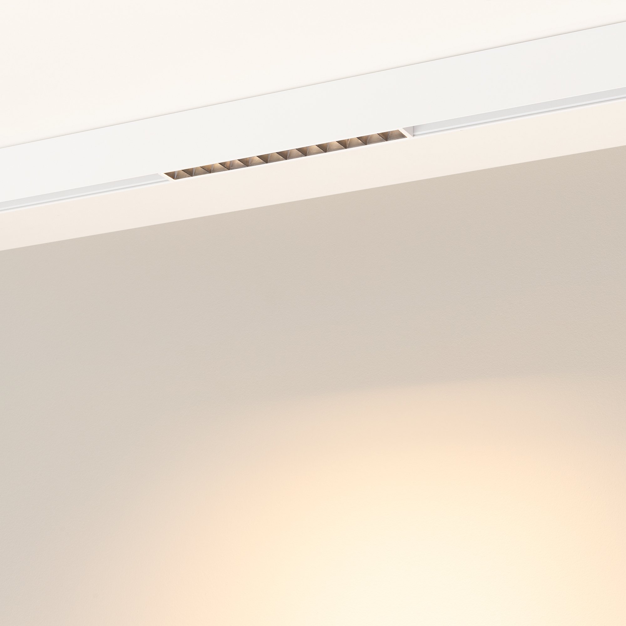 Светильник для магнитных треков MAG-ORIENT шириной 26 мм. Мощность 8 Вт, св. поток 440 лм, 55 лм/Вт, теплый 3000 K, CRI>90, угол24°, напряжение питания 48 В. Белый прямоугольный корпус из металл, экран поликарбонат, степень защиты IP20. Размер: длина 235 мм, ширина 22 мм, высота 42 мм. Монтаж на трек MAG-ORIENT. Пульсация <1%.