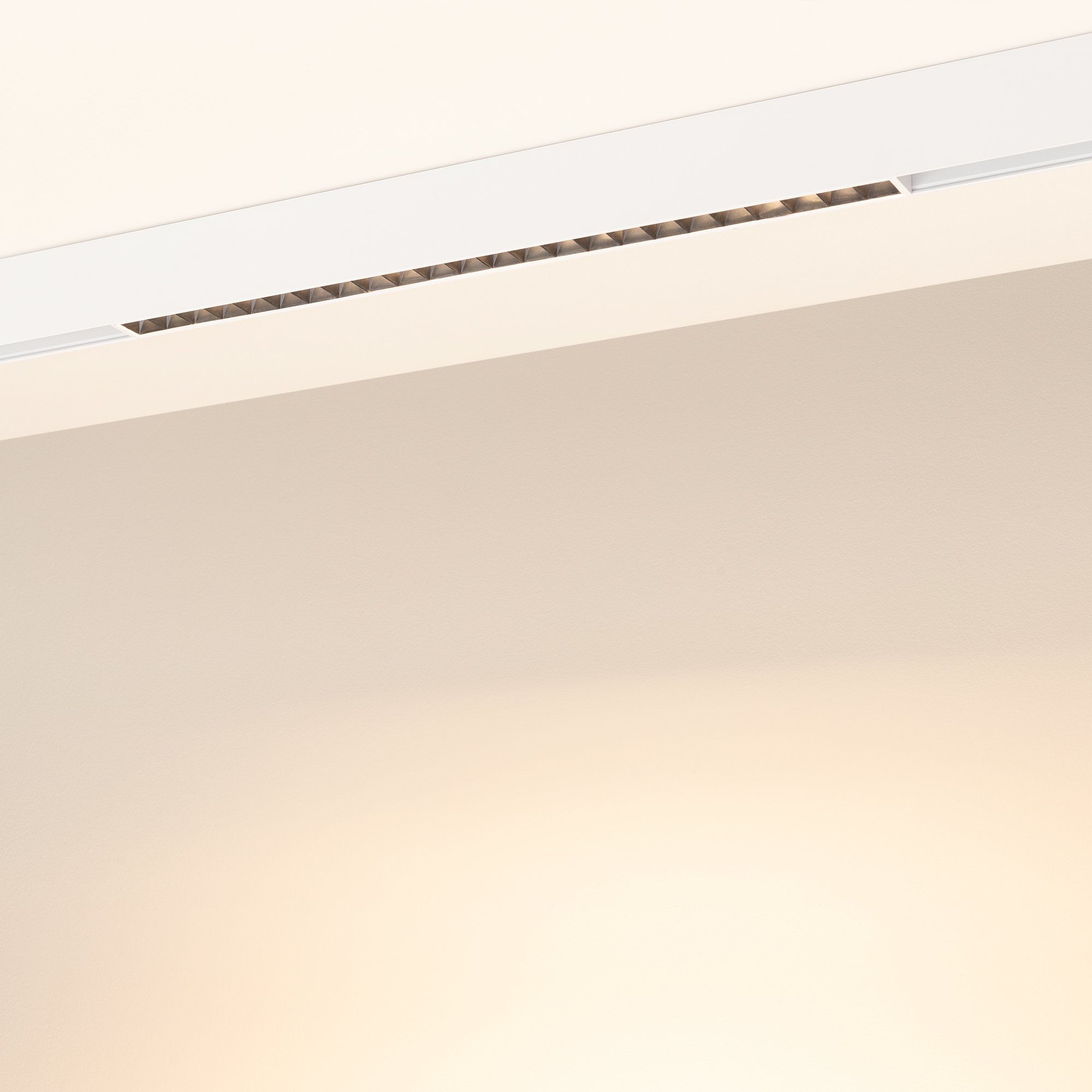 Светильник для магнитных треков MAG-ORIENT шириной 26 мм с управлением DALI. Мощность 16 Вт, св. поток 870 лм, 55 лм/Вт, теплый 3000 K, CRI>90, угол 24°, напряжение питания 48 В. Белый прямоугольный корпус из металл, экран поликарбонат, степень защиты IP20. Размер: длина 462 мм, ширина 22 мм, высота 42 мм. Монтаж на трек MAG-ORIENT. Пульсация <1%.