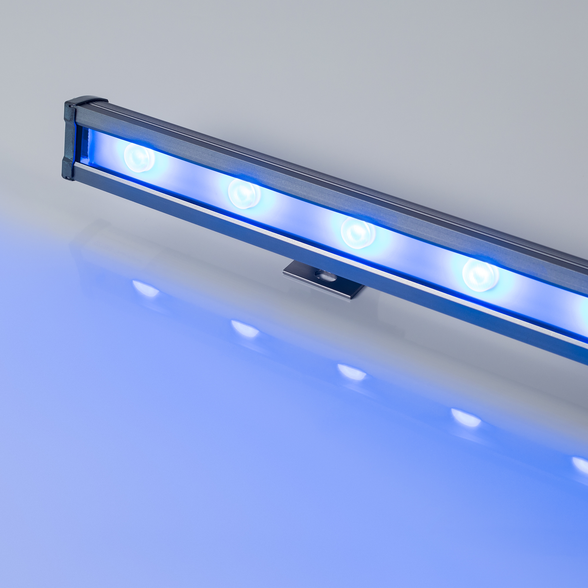 Линейный светодиодный прожектор LINE мощностью 48 Вт с температурой свечения RGB широко используется для декоративной подсветки зданий, а также архитектурных и скульптурных объектов: памятников, мостов, арок и т. д. Специальная оптика формирует световой поток с узконаправленным углом излучения, который создает яркую и красивую иллюминацию фасадов зданий с акцентом на архитектурных формах. Алюминиевый корпус с прочным экраном из армированного стекла и степенью пылевлагозащиты IP65 дает возможность эксплуатировать прожектор как в помещениях, так и на открытом воздухе. Напряжение питания составляет 24В, а управление цветами, яркостью и световыми сценариями выполняется по протоколу DMX512 (блок питания DC24В и контроллер приобретаются отдельно). Герметичные разъемы, входящие в комплект, упрощают подключение прожектора к кабелю питания и соединение прожекторов последовательно в группы, а два поворотных кронштейна обеспечивают надежный монтаж на поверхности.