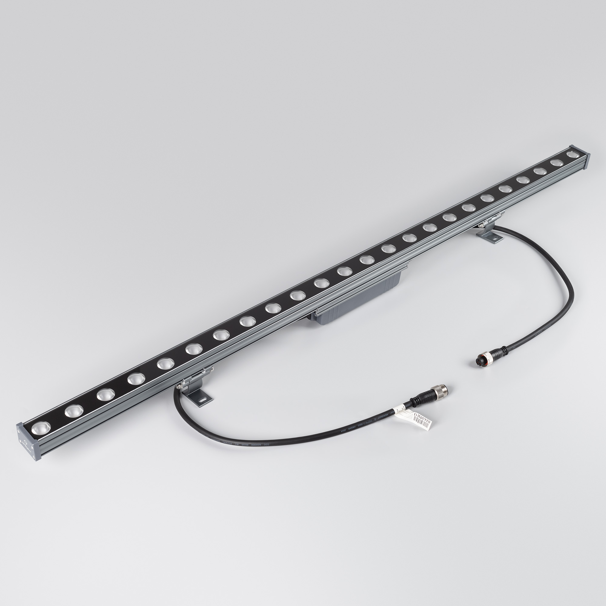 Линейный прожектор. Мощность 24 Вт, св. поток 1920 лм, 80 лм/Вт, теплый 3000 K, CRI>80, угол 30°, напряжение питания 230 В. Серый прямоугольный корпус из алюминия, экран стекло, степень защиты IP65. Размер: длина 1000 мм, ширина 40 мм, высота 30 мм. Монтаж на кронштейнах.