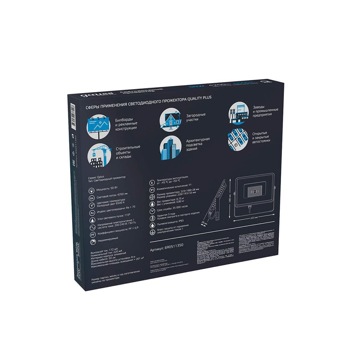 Прожектор светодиодный Gauss Qplus 50W 6500К 690511350 от производителя Gauss. Артикул производителя GAUSS_690511350.