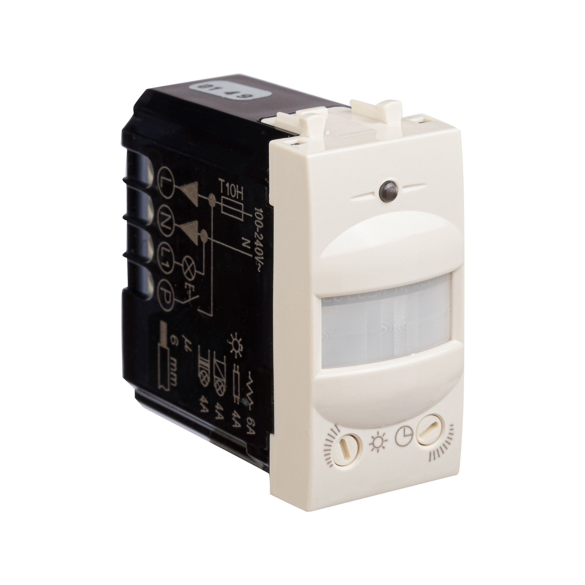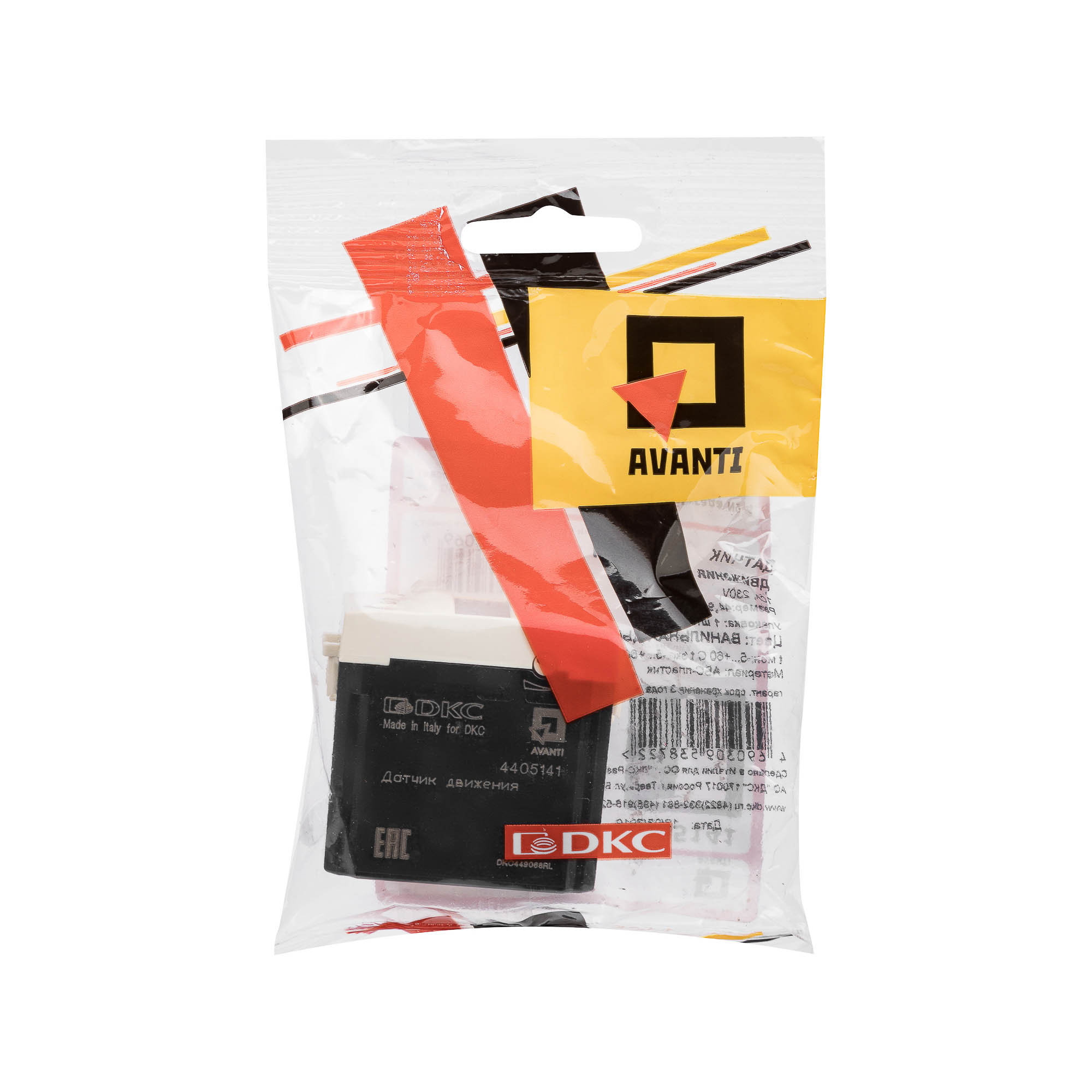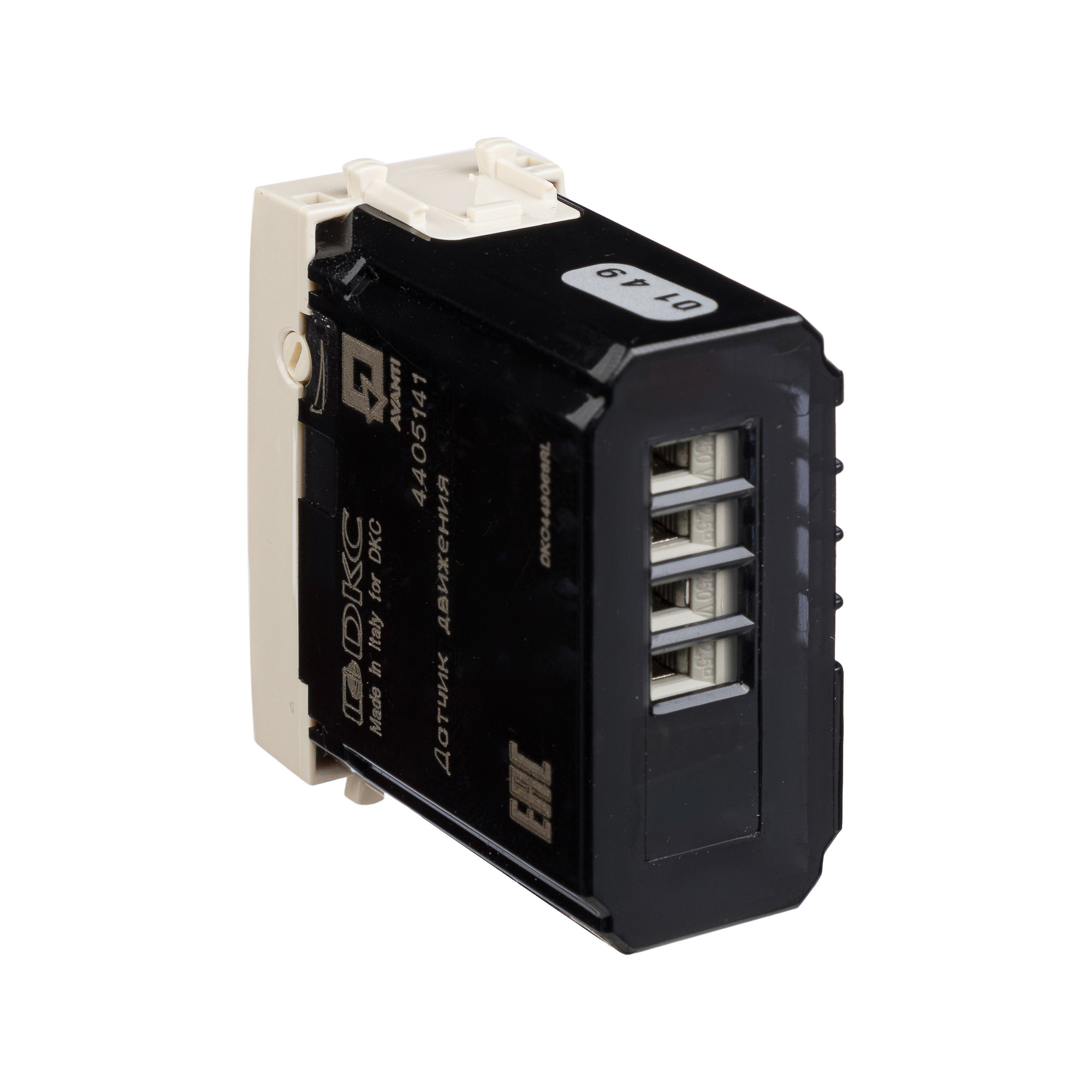 Модульный датчик движения ДКС – составная часть электроустановочных изделий серии "Avanti". Прибор размещается в кабель-канале. Его применение позволяет автоматически включать свет в проходных зонах во время присутствия там людей и выключать – когда движения в этой зоне нет. В датчиках установлен пассивный инфракрасный сенсор с дальностью действия 9 метров (фронтально) и углом сканирования 180 градусов. Материал датчика – термопласт. Цвет – "Ванильная дымка".