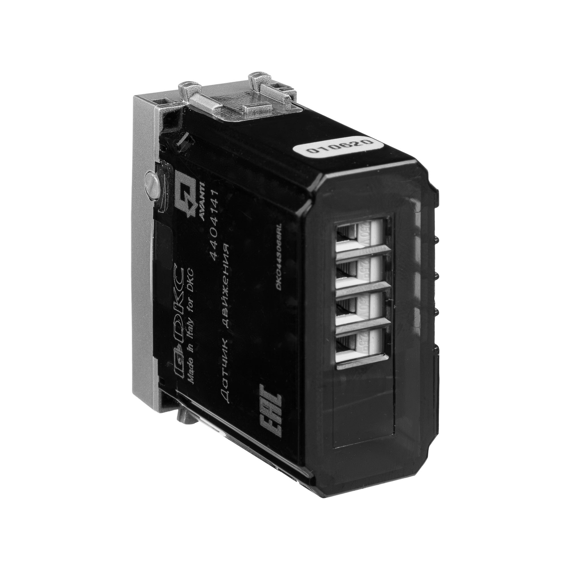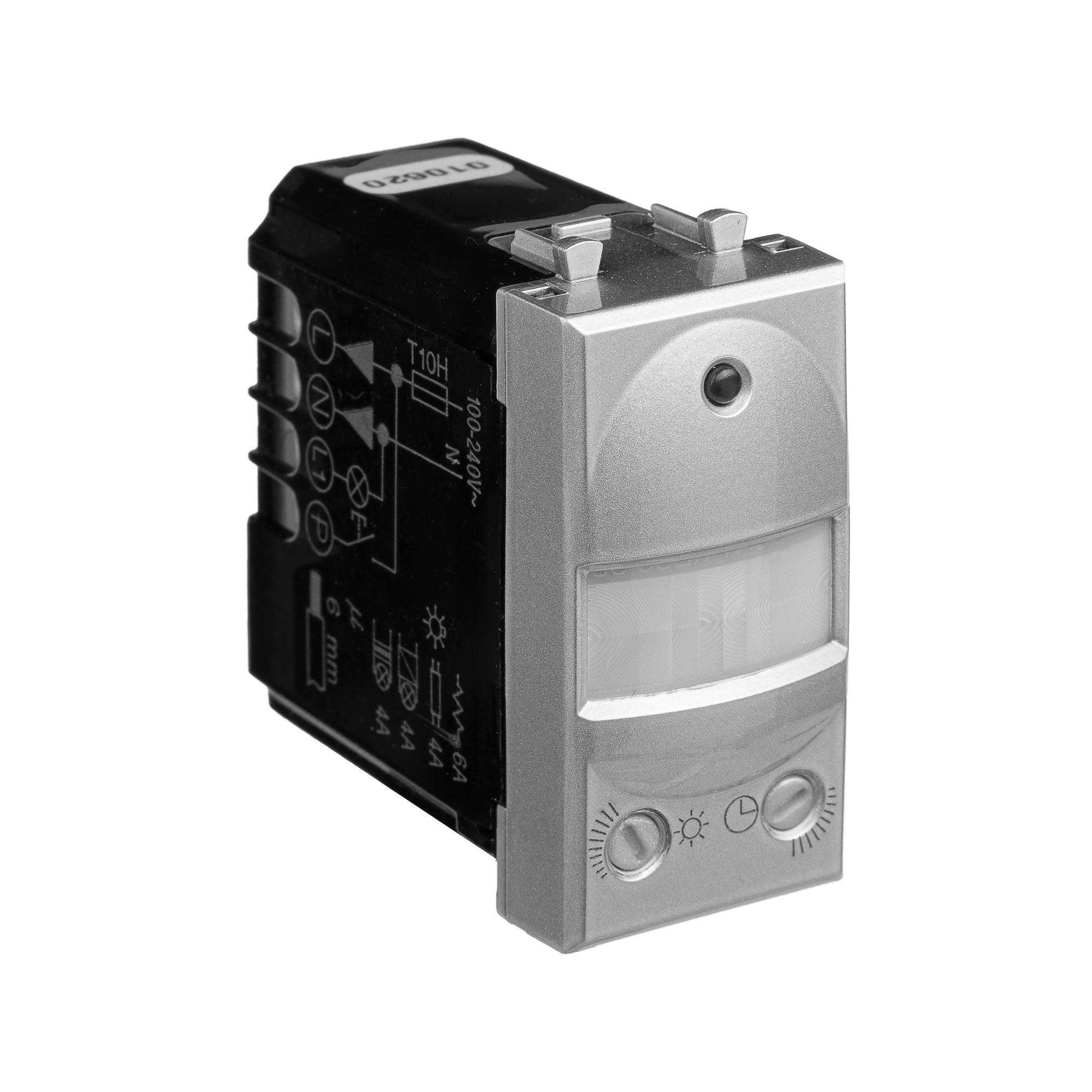 Датчик движения модульный. Назначение: для монтажа в системы "In-liner Front" и "In-liner Aero" при помощи рамок-суппортов и каркасов "Avanti" (код 4400912 и т.д.); автоматическое включение/выключение света. Характеристики: диаметр отверстий для ввода кабелей – 3 мм; винтовые зажимы; шаблон для зачистки кабеля – 11 мм; расстояние обнаружения – от 2 до 12 м угол охвата – 150°; время задержки отключения (от 10 с до 7 мин.); настройка светочувствительности датчика; настройка порога освещенности; фиксация в подрозеточные коробки глубиной не менее 45 мм при помощи каркаса с лапками (код 4400802) и саморезов. Кол-во модулей: 1. Цвет: "Закаленная сталь"