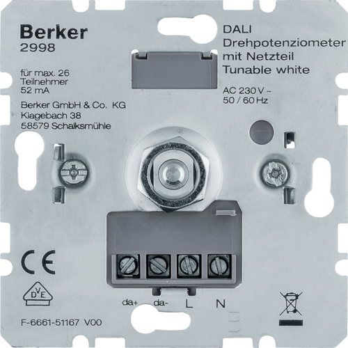 Berker Поворотный потенциометр DALI, Tunable white, со встроенным блоком питания. Благодаря использованию только лучших материалов и тщательному контролю качества, электроустановочные изделия (рамки, розетки, выключали) Berker стали надежным выбором для многих потребителей по всему миру. Их функциональность сочетается с эстетичным внешним видом, что делает их привлекательными для использования в различных интерьерах.