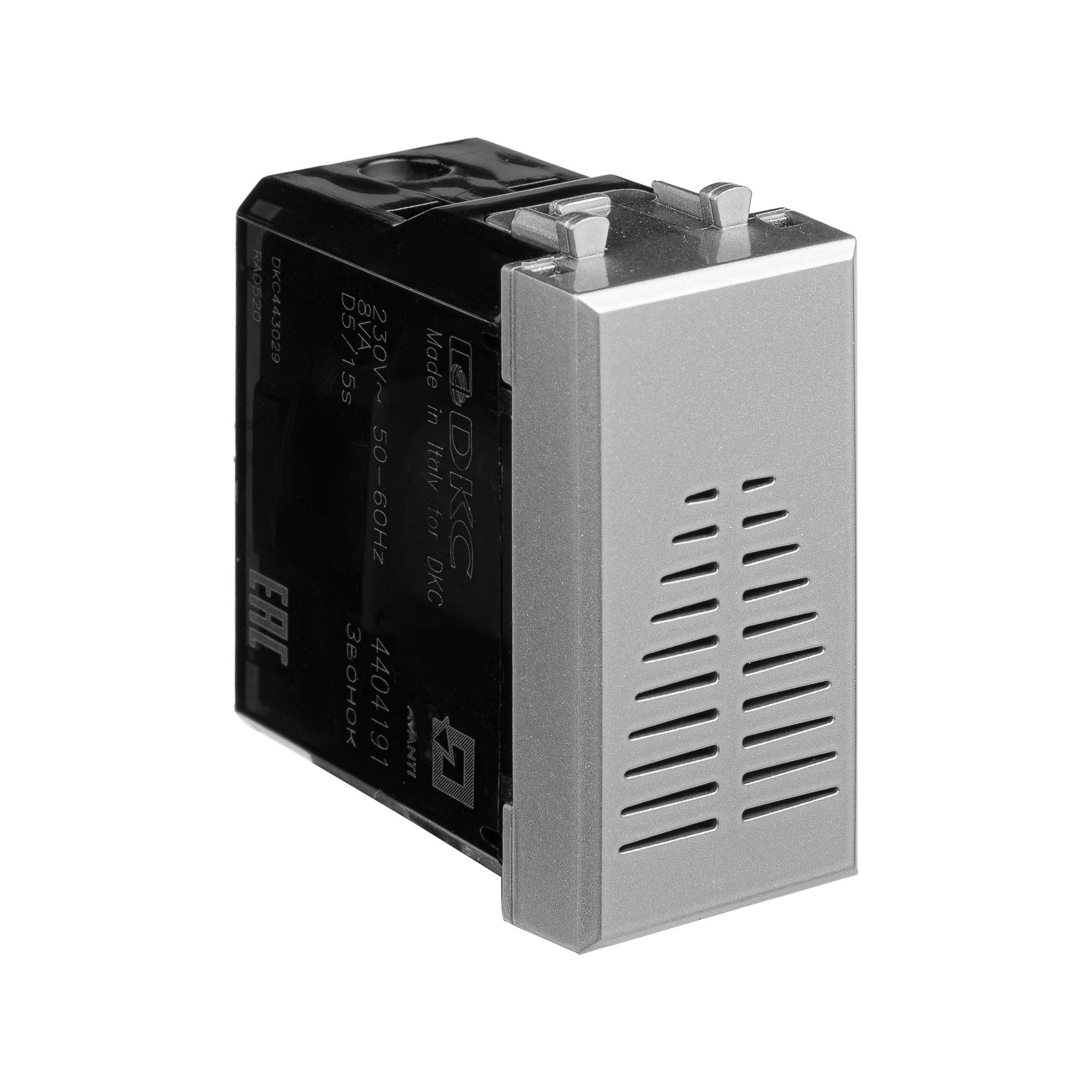 Звонок модульный. Назначение: для монтажа в системы "In-liner Front" и "In-liner Aero" при помощи рамок-суппортов и каркасов "Avanti" (код 4400912 и т.д.); звуковая индикация. Характеристики: винтовые зажимы; номинальное напряжение – 230 В; фиксация в подрозеточные коробки глубиной не менее 45 мм при помощи каркаса с лапками (код 4400802) и саморезов. Кол-во модулей: 1. Цвет: "Закаленная сталь"